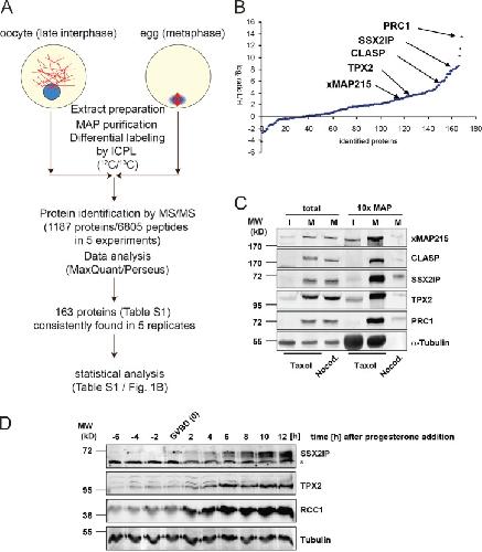Figure 1. Identification and validation of SSX2IP as a MAP. (A) Workflow for the comparison of the MT interactome in interphase (stage VI X. laevis oocytes) and metaphase (unfertilized X. laevis eggs) by differential proteomics. (B) Protein abundance ratios (log2 of egg/oocyte ratio) of the 163 proteins found in five of five independent experiments. Median values of the five experiments are shown (see Table S1 for details). Note that most proteins are expressed more highly in metaphase. (C) Validation of the predicted metaphase MT association of identified proteins by immunoblotting. MAPs were purified from oocyte (interphase, I) or egg (metaphase, M) lysates by cosedimentation of taxol-stabilized MTs; nocodazole was used as a negative control. Total lysates were compared with MAP sediments, and tubulin served as a loading control. (D) Progesterone-treated, synchronously maturing X. laevis oocytes were analyzed for expression of SSX2IP, RCC1, and TPX2 (positive controls); tubulin was used as a loading control. Times are indicated with respect to nuclear (i.e., germinal vesicle) breakdown (GVBD). *, note the cross-reacting band at 55 kD in the SSX2IP blot. |