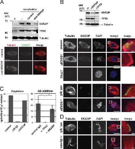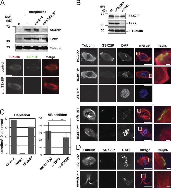 Figure 2. SSX2IP depletion does not interfere with centrosome-free spindle formation. (A) Expression of SSX2IP during in vitro maturation was specifically suppressed by MO oligonucleotides but did not alter meiotic spindle morphology; immunoblotting and indirect immunofluorescence detect SSX2IP and tubulin. (B and D) Chromatin-induced spindle assembly was monitored in X. laevis egg extracts that were mock-depleted (control, ct), immunodepleted of SSX2IP (ΔSSX2IP) or TPX2 (ΔTPX2), or supplemented with control (ctrl.) or anti (α)-SSX2IP antibodies (B). In D, control (ctrl.) antibodies or antibodies against Dynein intermediate chain were used. The blot in B shows depletion efficiencies; images display chromatin bead spindles (red, tubulin; green, SSX2IP; blue, DAPI). Please note that SSX2IP antibody addition efficiently inhibits pole localization of SSX2IP. (C) Quantification of assembled chromatin bead spindles in depleted extracts as indicated (left graph; this experiment was completed once, n = 100), or after addition of specific anti-SSX2IP or anti-TPX2 antibodies (right graph shows mean values ± SD of three independent experiments). The significance was calculated by a Student’s t test (two-tailed) and scored as follows: *, P < 0.05; **, P < 0.01. The magnified panels (magn.) show enlarged views of the boxed regions. Bars: (main panels) 20 µm; (magnified panels) 2 µm. |