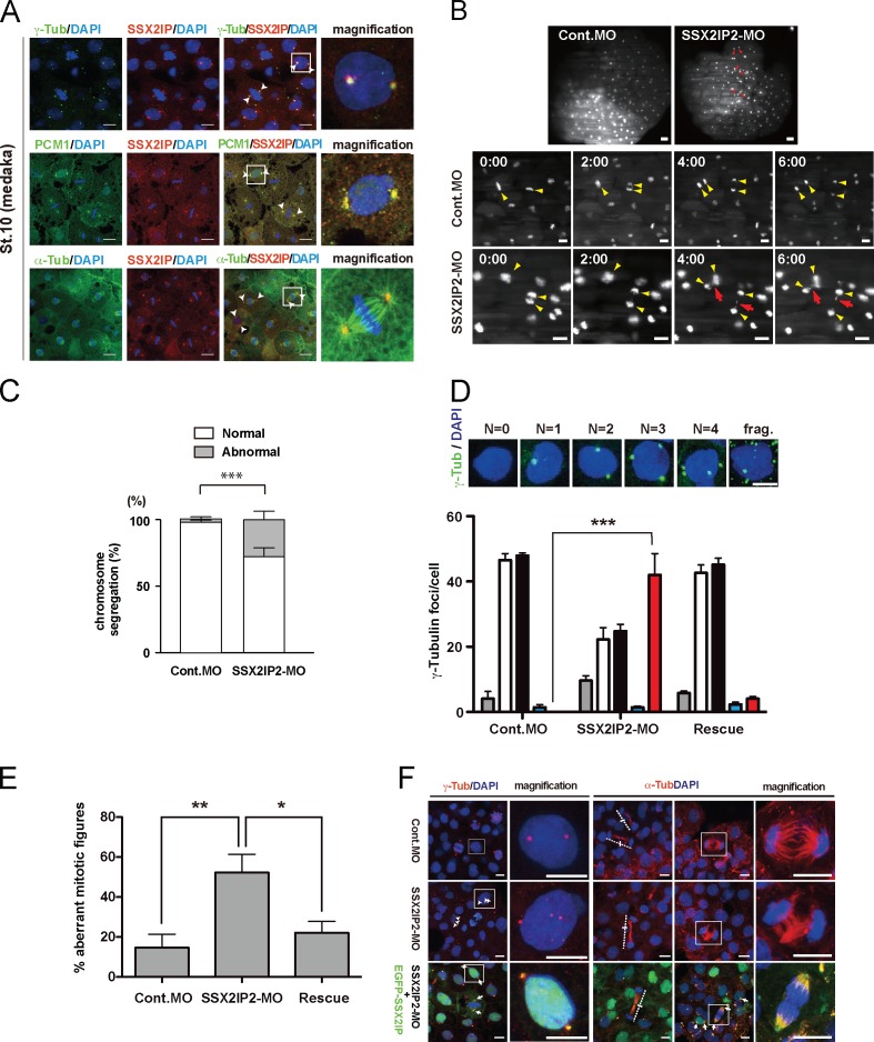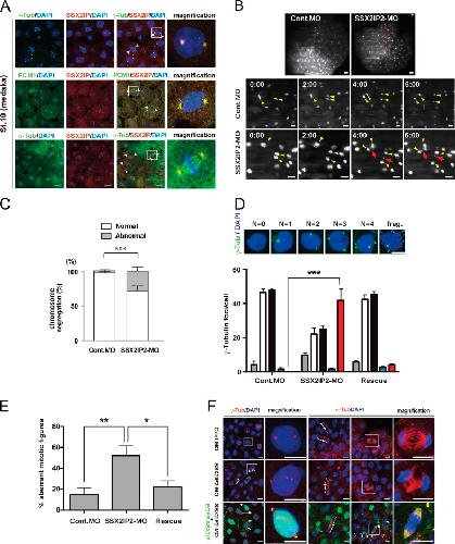 Figure 5. Chromosome segregation defects in SSX2IP2 MO–treated eggs. (A) Low concentrations of SSX2IP antibodies (100 ng/µl, injected at one-cell stage eggs of medaka) were used to localize SSX2IP in embryos developed to stage 10–11. Colors of labels indicate colors of respective proteins. Magnified panels (magn.) show enlarged views of the boxed regions. (B) Medaka eggs were coinjected with either control MO (Cont. MO) or SSX2IP2-MO, and Histone H2B-GFP (H2B-GFP) mRNA. Developing embryos were analyzed around stage 8 with DSLM. (top) Representative global images of MO-treated embryos. Red arrowheads in SSX2IP-MO show abnormal cell divisions. (bottom) Still images of dividing blastomeres in Cont.MO and SSX2IP-MO injected eggs. Yellow arrowheads indicate dividing cells; red arrows indicate lagging chromosomes. Each image was taken with an interval of 1 min. (C) Quantification of abnormal chromosomes/lagging chromosomes in control and MO-injected eggs. The significance was calculated by a Student’s t test (two-tailed) and scored ***, P < 0.001. Error bars indicate SD. (D–F) Rescue of SSX2IP-knockdown eggs by EGFP-OlSSX2IP2 (EGFP-SSX2IP) expression. Eggs were coinjected with SSX2IP2-MO and EGFP-SSX2IP. (D) Quantification of γ-tubulin foci in MO-treated and rescued eggs. Numbers of γ-tubulin foci were categorized as shown in representative images of γ-tubulin staining (top panels). The significance was calculated using six or seven independent experiments, in which at least 100 structures were counted. Significance was scored by a Student’s t test (two-tailed) as follows: ***, P < 0.001; ****, P < 0.0001. Error bars indicate SD. (E) Quantification of abnormal spindles in MO-treated and rescued eggs. The significance was calculated by a Student’s t test (two-tailed) and scored as follows: *, P < 0.05; **, P < 0.01. Error bars indicate SD. (F) γ-tubulin and α-tubulin, in MO-treated and rescued eggs at stage 10, was visualized as indicated by the colored legends. Dashed lines crossed by a bar indicate telophase spindles. Magnified panels (magn.) show enlarged views of the boxed regions. Arrowheads indicate abnormal numbers of centrosomes. Arrows indicate localization of EGFP-SSX2IP at the centrosome. Bars: (A) 10 µm; (B, top) 40 µm; (B, bottom) 20 µm; (D) 20 µm; (F) 10 µm. |