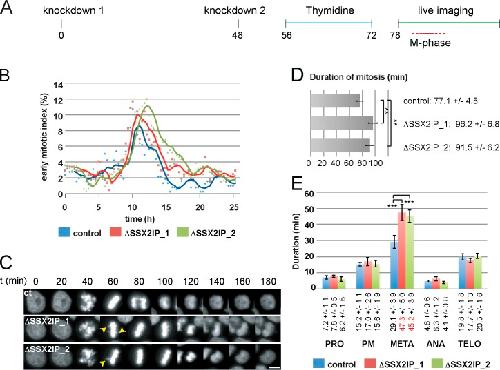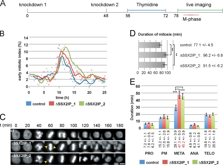 Figure 7. Knockdown of SSX2IP compromises mitotic MT nucleation and dynamics, and delays mitotic progression. Mitotic progression of HeLa cells stably expressing Histone 2B was analyzed by time-lapse recording. (A) Experimental setup. (B) Analysis using the CellCognition (Held et al., 2010) image recognition software. An early mitotic index (prometaphase, metaphase) was determined via automatic annotation; one representative analysis (out of at least four analyses) for the indicated situations is shown. (C) Histone 2B still images (20-min intervals) in cells progressing through mitosis in control situations, or after knockdown of SSX2IP. Arrowheads indicate nonaligned chromosomes; see also Videos 4 and 5. Bar, 10 µm. (D and E) Quantification of mitotic timing (D: overall duration; E: single mitotic phases; PRO, prophase; PM, prometaphase; M, metaphase; A, early anaphase; TELO, late anaphase and telophase) in control and SSX2IP knockdown cells that were analyzed by manual tracking for all conditions (n ≥ 34, in 4/5 independent experiments). The graphs represent mean values ± SD. The significance was scored by a two-tailed Student’s t test and scored as **, P < 0.01; ***, P < 0.001. |