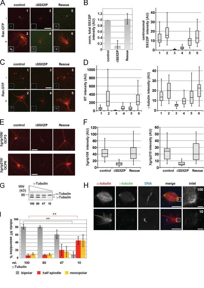 Figure 4. SSX2IP is required for mitotic centrosome maturation. (A) Localization of SSX2IP on centrosomes. Extracts were incubated with centrosomes and labeled tubulin (red) in the presence or absence of RanGTP. A labeled SSX2IP antibody (green) was added 5 min before squash fixation on coverslips. Note that the RanGTP-dependent centrosome maturation assay was done in TPX2-depleted extracts that do not nucleate self-organized MTs but leave MT nucleation exclusively to centrosomal asters. Insets of the same scale as the images highlight SSX2IP on centrosomes. (B, left) SSX2IP total levels in control, depleted, and reconstituted extracts were quantified by immunoblotting from three independent experiments. (B, right) SSX2IP levels on centrosomes were assayed and quantified as described previously (Yokoyama et al., 2008). (C and E) Samples as in A were fixed after aster assembly, spun down on coverslips, and stained with γ-tubulin antibodies (C, green) or Xgrip109/GCP3 or Xgrip210/GCP6 antibodies (E, green). Insets in C of the same scale as the images highlight γ-tubulin on centrosomes. (D and F) MT intensity and γ-tubulin (D) or Xgrip109 and Xgrip210 (F) levels in centrosomal asters were quantified as described previously (Yokoyama et al., 2008). (G) γ-TuRC levels were reduced in X. laevis egg extracts by immunodepletion using an antibody against γ-tubulin (Zheng et al., 1995); numbers indicate relative γ-tubulin levels. (H) Representative images from bipolar spindles in control (100% γ-TuRC levels) and half-spindles after removing 90% γ-TuRC (10% residual levels). Red, α-tubulin; green, γ-tubulin; blue, DAPI/DNA. Insets show γ-tubulin signals. (I) Mitotic MT assemblies after removing γ-TuRC were analyzed. n > 80 structures counted in all samples; graph shows mean ± SD from three independent experiments. The significance (100 vs. 10% γ-tubulin) was calculated by a Student’s t test (two-tailed) and scored as **, P < 0.01. Bars: (main panels) 20 µm; (magnified regions indicated by white boxes) 2 µm. |
