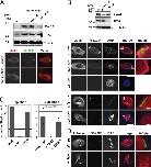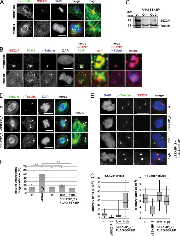 Figure 6. SSX2IP is required for centrosome stability in human somatic cells. (A) Localization of endogenous SSX2IP in human retinal pigment epithelium (RPE) cells in interphase and metaphase as indicated. Green, α-tubulin; blue, chromatin; red, SSX2IP; magnified merges do not display chromatin. Magnified panels (magn.) show enlarged views of the boxed regions. (B) Colocalization of SSX2IP (red), PCM-1 (green), and γ-tubulin (blue) in RPE-1 cells in interphase and mitosis; merges display colocalization between SSX2IP and PCM-1, or SSX2IP and γ-tubulin as indicated. Merges do not display chromatin. Magnified panels (magn.) show enlarged views of the boxed regions. (C) Immunoblots to document siRNA-mediated down-regulation of SSX2IP with two different siRNA oligos (Ol. 1 and 2). α-Tubulin served as a loading control. (D) Mitotic figures after knockdown of SSX2IP in RPE-1 cells. Green, α-tubulin; red, γ-tubulin; blue, DAPI/chromatin. Arrowheads indicate fragmentation of the γ-tubulin signals. (EâG) Analysis of mitotic figures in HEK293T wt cells and cells constitutively expressing low levels (âlowâ) of an siRNA-resistant, FLAG-tagged version of human SSX2IP and high levels after addition of doxycycline (âhighâ). (E) Green, γ-tubulin; red, SSX2IP; blue, DAPI/chromatin. (F) Quantification of mitotic fragmentation of γ-tubulin. The graph shows mean ± SD from five (wt) or three (stable expression of FLAG-SSX2IP) independent experiments; the significance was calculated by a Studentâs t test (two-tailed) and scored as *, P < 0.05; **, P < 0.01. (G) SSX2IP (left) and γ-tubulin (right) levels at mitotic centrosomes after knockdown of SSX2IP in wt cells or cell lines stably expressing SSX2IP. The data distribution from one representative experiment out of four repetitions is shown; n > 35. Bars, 10 µm. |