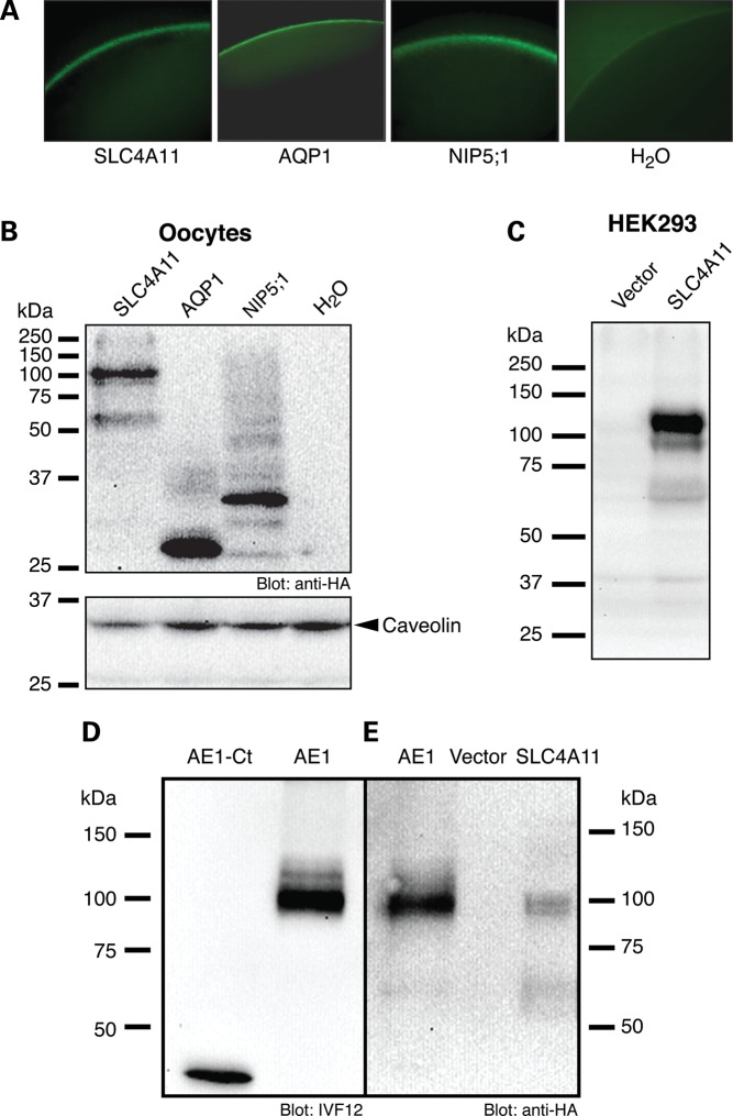 Figure 1. Quantification of SLC4A11 expression. (A) Confocal immunofluorescence of oocytes injected with the indicated RNA transcripts. HA-tagged proteins were detected using mouse anti-HA antibody and visualized using chicken anti-mouse IgG conjugated with Alexa Fluor 488 (green). (B) Oocytes, injected with cRNA encoding HA-epitope tagged SLC4A11, AQP1, NIP5;1 or with water alone were fractionated to produce a membrane-rich extract. Samples corresponding to 10 oocytes were probed on immunoblots with anti-HA antibody and caveolin antibody as a marker of the amount of membrane protein present, to enable measurement of the amount of HA-tagged protein/oocyte. (C) HEK293 cells were transfected with SLC4A11 cDNA or with vector alone were probed on immunoblots with a polyclonal antibody generated in rabbit against a synthetic peptide corresponding to amino acids 37â50 of human SLC4A11, in the putative cytoplasmic N-terminal domain of the protein. (D) AE1-Ct (40 ng protein) and 50 µg of protein from HEK293 cells transfected to express HA-epitope-tagged human AE1 (25) were immunoblotted and probed with mouse monoclonal anti-AE1 antibody, IVF12 (46). Densitometry of the immunoblot revealed the relative amounts of AE1 antigen present in the two preparations. (E) HEK293 cell lysate, containing 60 ng AE1, was electrophoresed along with a lysate of X. laevis oocyte membranes, corresponding to 10 oocytes. Densitometry revealed that each oocyte therefore contains 15 ng SLC4A11, corresponding to 9.1 à 109 SLC4A11/oocyte.