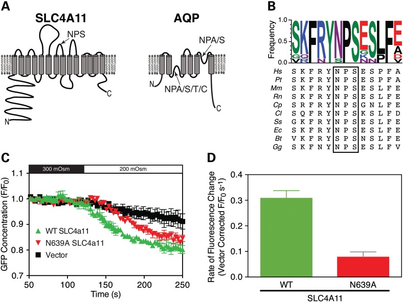 Figure 3. Loss of water-flux upon mutation of an NPS motif. (A) Schematic topology models for SLC4A11 and for the AQP family of proteins, with the outside of the cell at the top. Positions of conserved AsparagineâProline-X (NPX) motifs are indicated by arrows. (B) Amino acid sequence alignments of the region around the NPX motif found in SLC4A11 (boxed). Species are: Human (Homo sapiens (Hs)), Chimpanzee (Pan troglodytes (PT)), Mouse (Mus Musculus, Mm), Rat (Rattus norvegicus, Rn), Guinea pig (Cavia porcellus, Cp), Dog (Canis lupus familiaris, Cl), Pig (Sus Scrofa, Ss), Horse (Equss caballus, Ec), Cattle (Bos Taurus, Bt) and Chicken (Gallus gallus, Gg). The degree of conservation is indicated at the top by amino acid frequency, represented by the relative height of each single-letter coded amino acid (WebLogo software) (47). (C) Water permeability of HEK293 cells expressing WT or N639A SLC4A11 was assessed, by following the rate of change of eGFP fluorescence after cells were exposed to hypotonic medium. (D) Comparison of WT and N639A rates of cell swelling following hypo-osmotic challenge. The rate of fluorescence change was corrected for activity of vector-transfected cells (0.19 ± 0.02 sâ1). Data represent mean ± SE of three independent swelling experiments with 30â40 cells measured per assay.
