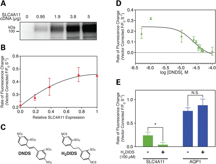 Figure 4. Water-flux is proportional to SLC4A11 expression level and is inhibited by stilbene disulfonates. (A and B) HEK293 cells were co-transfected with eGFP cDNA and indicated amount of cDNA encoding HA-tagged wild-type (WT) SLC4A11. (A) SLC4A11 expression was quantified on immunoblots of cell lysates probed with anti-HA antibody. (B) Cell swelling of HEK293 cells, expressing various amounts of SLC4A11, was assessed by the eGFP dilution assay (as in Fig. 2C). The rate of swelling observed for vector-alone transfected cells was subtracted from the values observed for cells expressing SLC4A11. (C) Chemical structures of SLC4A11 inhibitors used here. (D and E) HEK293 cells were co-transfected with eGFP and either SLC4A11, AQP1 or vector cDNA. Water-flux following shift to hypo-osmotic medium, assessed by measuring the rate of eGFP fluorescence change (as in Fig. 2C), was corrected for rate in vector-transfected cells. (D) Water-flux assays were performed in the presence of varied concentrations of DNDS, a non-covalently acting compound classically used to inhibit proteins of the SLC4 family (48). Half-maximal effective concentration determined from the curve is 24 ± 1 µM DNDS, n = 3. (E) eGFP dilution water-flux assays were performed in the absence or presence of 100 µM H2DIDS, a covalently acting stilbene disulfonate. Rates of fluorescence change were corrected for the value found for vector-transfected cells. *P < 0.05. N.S., not significant. n = 3.