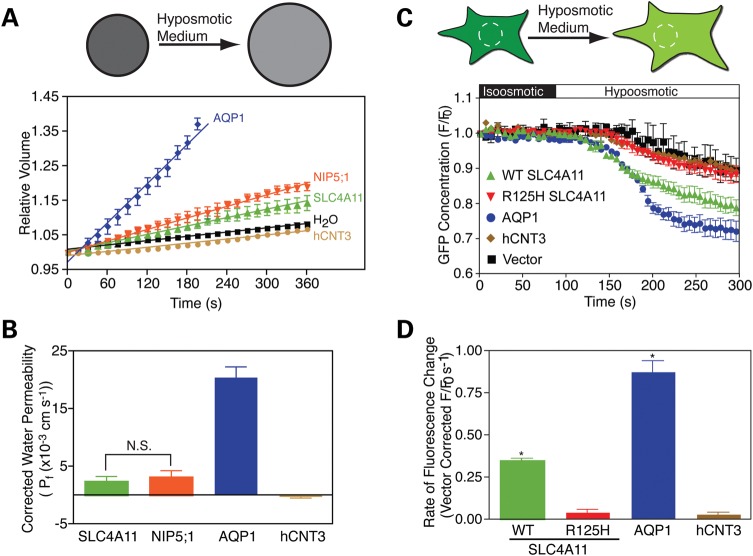 Figure 2. Water-flux through SLC4A11. (A) Xenopus oocytes were injected with H2O or H2O containing RNA transcripts encoding N-terminally HA-tagged SLC4A11, AQP1, NIP5;1 or untagged hCNT3. Osmotic swelling was induced by perfusing the oocytes with 44 mOsm/kg hypotonic solution at time zero, and oocyte volume was calculated from images captured digitally every 15 s. Top of panel diagrammatically shows a spherical oocyte swelling in response to hypo-osmotic medium. (B) Osmotic water permeabilities (Pf) were calculated (23) for oocytes and corrected for the value observed in H2O-injected oocytes (2.9 ± 0.09 à 10â3 cm sâ1). Bars represent mean ± SE from three separate swelling assays with 10 oocytes per assay. N.S., not significant. (C) HEK293 cells were transiently co-transfected with eGFP cDNA and SLC4A11 (WT and R125H mutant), hCNT3, AQP1 cDNAs or empty vector. Cells were perfused alternately with isotonic (black bar) and hypotonic (white bar) medium. eGFP fluorescence in regions of interest was measured digitally from images captured every 250 ms, but here only one data point every 3 s is shown. Top of panel diagrammatically represents a eGFP-expressing cell swelling in response to hypotonic medium. White circle represents the region of interest monitored to measure the change of eGFP concentration. (D) Rate of fluorescence change, calculated by linear regression of the initial intensity change during the first 15 s of perfusion with hypotonic buffer, was corrected for activity of vector-transfected cells (0.19 ± 0.005 sâ1). Data represent the mean ± SE of six independent swelling experiments with 30â40 cells measured per assay. *Significant difference (P < 0.01) compared with hCNT3.