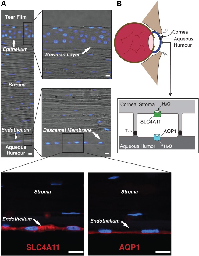 Figure 6. SLC4A11 and AQP1 in human cornea. (A) Bright field and confocal immunofluorescence microscopy images of paraffin-embedded human cornea. Cornea sections were incubated with rabbit anti-SLC4A11 or rabbit anti-AQP1 serum, followed by goat anti-rabbit IgG conjugated with Alexa Fluor 594 (red). Nuclei were detected with DAPI (blue). Scale bars represent 10 µm. (B) The endothelial cell layer separates the corneal stroma from the aqueous humour. Fluid accumulates in the stroma, which is reabsorbed by the endothelial cell layer to prevent corneal oedema. Localization of AQP1 and SLC4A11 to opposite poles of endothelial cells suggests they may work cooperatively to provide a water conductive pathway through the endothelial layer. T.J. represents the tight junction that connects cells of the endothelium.