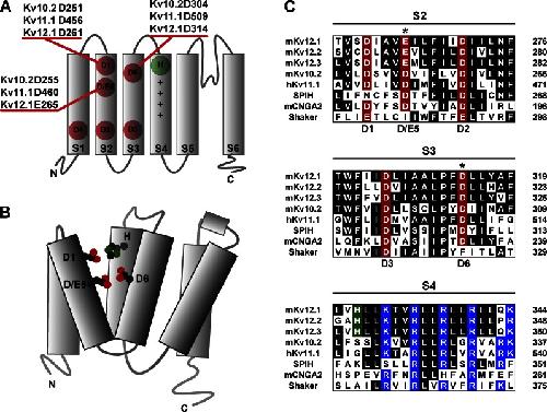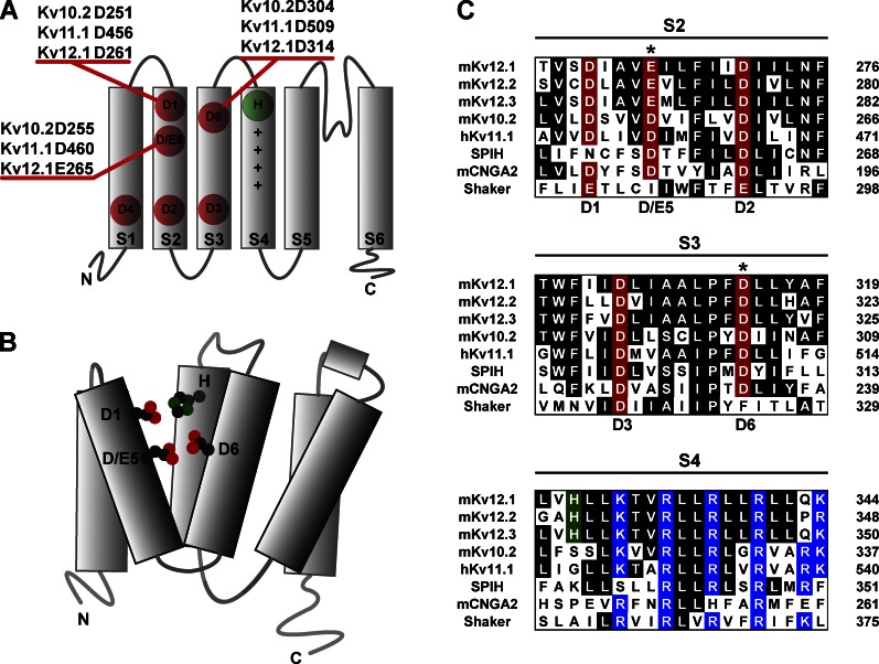 Figure 1. Acidic residues in the voltage sensor of EAG superfamily channels. (A) A single subunit of a tetrameric EAG superfamily K+ channel is diagrammed with transmembrane domains S1–S6 depicted as rectangles. S1–S4 form the voltage sensor, and S5–S6 constitute the conduction pathway. Acidic residues of the voltage sensor are marked in red. Basic gating charges in the S4 helix are depicted with + symbols, and an Elk-specific histidine residue at the outer edge of S4 is marked in green. Acidic residues 1–3 are highly conserved across voltage-gated cation channels, and acidic residues 4–6 are specific to the EAG superfamily (among K+ channels). Residue positions for the three S2/S3 acidics that are accessible from the extracellular side (D1, D/E5, and D6) are given for mouse Kv10.2, human Kv11.1, and mouse Kv12.1. (B) Schematic structural drawing of a single subunit of an Elk family K+ channel. Side chains of four residues participating in binding of divalent cations are depicted with oxygens and nitrogens highlighted in red and green, respectively. These residues (D1, E5, D6, and the Elk-specific histidine in S4) are predicted to lie in close proximity within an aqueous cleft in the outer voltage sensor. (C) Amino acid alignments of the transmembrane voltage sensor helices S2–S4 are shown for various EAG superfamily K+ channels, the olfactory CNG channel α subunit (CNGA2), a sea urchin HCN channel (SPIH), and Drosophila Shaker. Species prefixes m and h in the channel names refer to mouse and human, respectively. Conserved residues are shaded. Acidic residues are labeled in red and marked with the position numbers defined in A. Asterisks mark the EAG-specific acidic residue positions in S2 and S3. Basic residues and Elk-specific histidine in S4 are highlighted in blue and green, respectively.