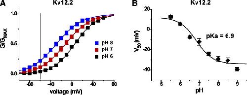 Figure 3. Effect of extracellular pH on voltage activation of Kv12.2. (A) Normalized GV curves determined in bath solutions of pH 6, 7, and 8 for Kv12.2; experiments were performed as described for Fig. 2 B, except depolarizing steps were limited to 2 s. Data points are mean, error bars show SEM (n = 3–5), curves depict single Boltzmann distribution fits, and the gray line marks −60 mV. (B) V50 versus pH is plotted for Kv12.2 with a three-parameter dose–response fit (pKa 6.9).