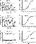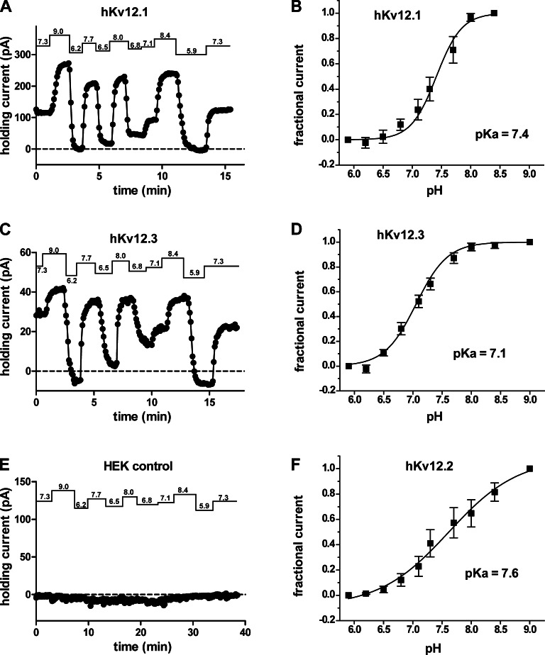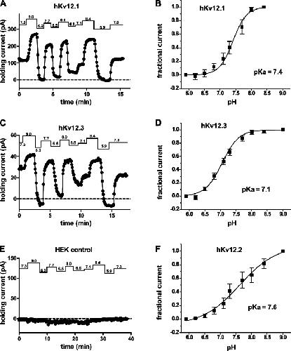Figure 4. Effect of bath pH changes on holding current in HEK293 cells expressing Elk channels. (A and C) Holding current versus time plots are shown for whole cell patch recordings of HEK293 cells expressing human Kv12.1 channel (A) and Kv12.3 channel (C) during a series of bath pH changes (values indicated above). Data points were taken every 5 s. A typical recording from an untransfected control cell is shown in E. (B, D, and F) Plots of holding current versus pH are given for human Kv12.1 (B), Kv12.3 (D), and Kv12.2 (F) channels. Data from individual cells were normalized to the magnitude of the holding current obtained at the highest and lowest bath pH values examined. Data points show mean ± SEM (n = 4–6), and curves show a four parameter dose–response fit with the predicted pKa value indicated.