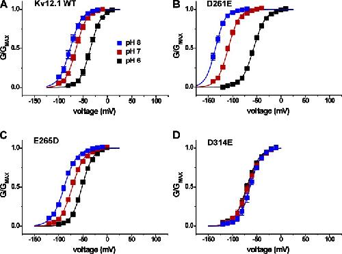 Figure 6. Effect of charge-preserving mutations at D1, E5, and D6 on the pH sensitivity of Kv12.1 channel. (A–D) Normalized GV relations are shown for WT Kv12.1, D261E (D1E), E265D (E5D), and D314E (D6E) at bath pH 6, 7, and 8. Conductance was determined from isochronal tail currents recorded at −40 mV after 8-s steps to the indicated voltages; values show mean ± SEM (n = 4–8), and curves show single Boltzmann distribution fits. Fit parameters (V50 and slope factor) are reported in Table 1.