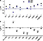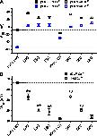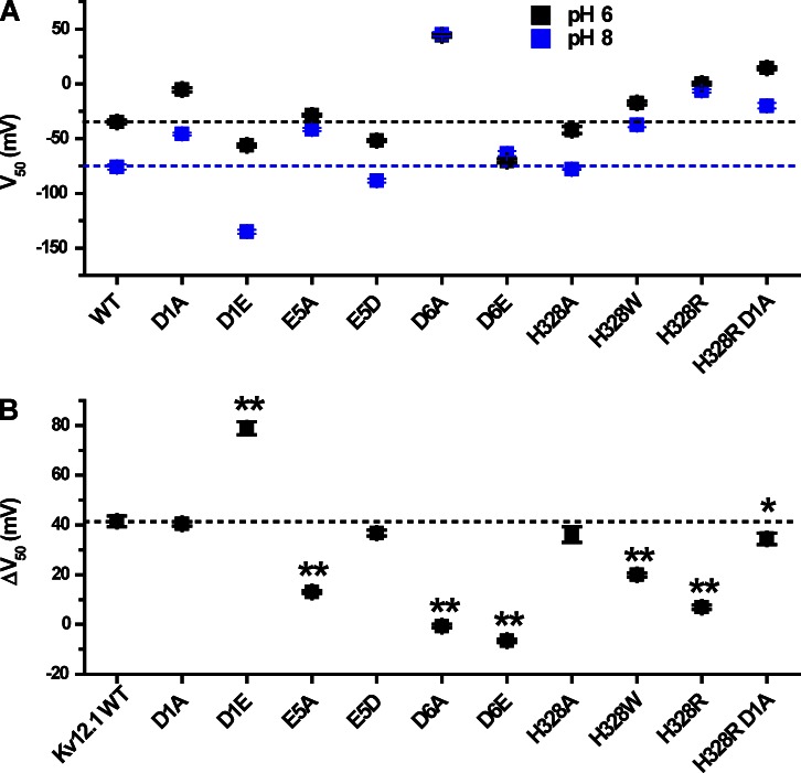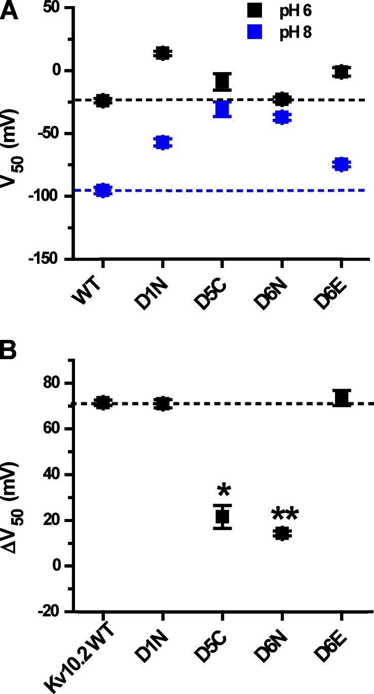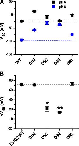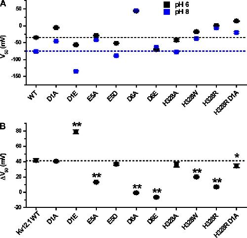 Figure 8. Comparison of V50 at pH 6 and 8 for Kv12.1 mutants. (A) V50 values are shown for pH 6 and 8 for WT and mutant Kv12.1 channels; values are taken from the single Boltzmann fits shown in Figs. 5–7. Dashed lines indicate the WT V50 values for pH 6 and 8. (B) Comparison of the pH 8 to 6 V50 shift for WT and mutant Kv12.1 channels. Shifts were calculated as a difference: ΔV50 = V50 (pH = 6) − V50 (pH = 8). The dashed line indicates the ΔV50 for Kv12.1 WT. Data points show mean ± SEM. Two-tailed nonequal variance Student’s t test was used to judge significance of the differences in ΔV50; asterisks indicate significant difference from WT: **, P < 0.001; and *, P < 0.05.