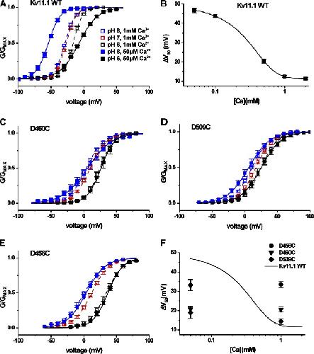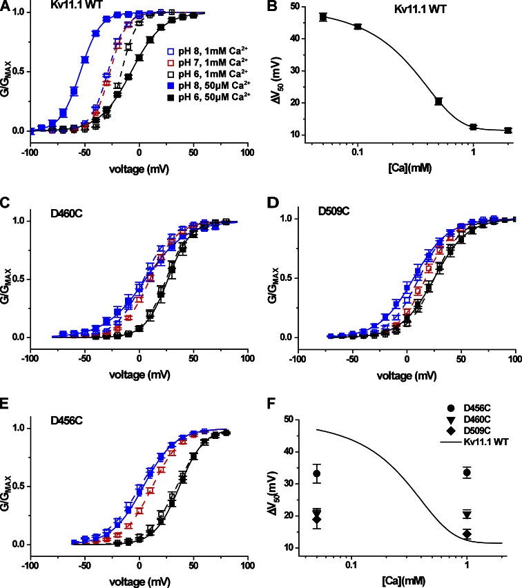 Figure 11. High pH sensitivity of Kv11.1 is revealed at low Ca2+ and depends on the EAG-specific acidic charges. (A) Normalized GV relations for Kv11.1 are shown for pH 6, 7, and 8 at 1 mM Ca2+ and for pH 6 and 8 at 50 µM Ca2+. Conductance values were determined from isochronal tail currents recorded at −40 mV after 4-s steps to the indicated voltages from a −100-mV holding potential. Data points show mean ± SEM (n = 4–10), and curves show Boltzmann fits; V50, slope factors, and ΔV50 (pH 8 to 6) are reported in Table 1 and Fig. 12. (B) ΔV50 (pH 8 to 6) for WT Kv11.1 is plotted as a function of Ca2+ concentration and fitted with a four-parameter dose–response curve. Log10 scale is applied to the Ca2+ concentration, and data points show mean ± SEM. (C–E) Normalized GV relationships for the EAG-specific charge mutants D460C (D5C) and D509C (D6C) and the universal acidic charge mutant D456C (D1C) are shown for pH 6, 7, and 8 at 1 mM Ca2+ and pH 6 and 8 at 50 µM Ca2+. Conditions are coded by shading and color as in A. Single Boltzmann fit parameters and ΔV50 (pH 8 to 6) are reported in Table 1 and Fig. 12, respectively. (F) ΔV50 (pH 8 to 6) for Kv11.1 acidic neutralization mutants at 50 µM and 1 mM Ca2+ are presented in comparison with the Kv11.1 WT fit curve from B.