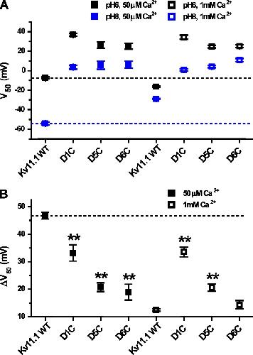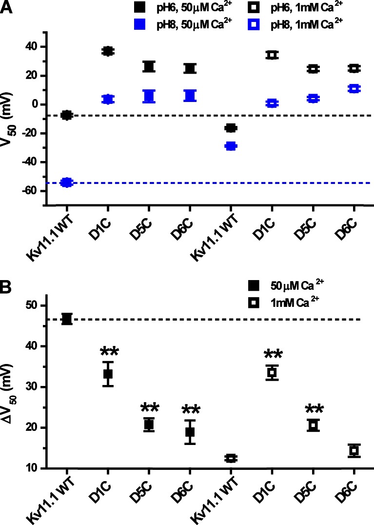 Figure 12. Analysis of V50 at external pH 8 and 6 for Kv11.1 mutants. (A) V50 values are shown for pH 6 and 8 for WT Kv11.1 and Kv11.1 acidic charge-neutralization mutants (dashed lines indicate WT values). The values of V50 were obtained from Boltzmann fits shown in Fig. 11 (A and C–E). (B) ΔV50 (pH 8 to 6) plots for Kv11.1 WT and the S2/S3 acidic charge-neutralization mutants at 50 µM Ca2+ and 1 mM Ca2+. The dashed line indicates the ΔV50 obtained for WT Kv11.1. Asterisks indicate significant difference with respect to WT: **, P < 0.001; two-tailed nonequal variance Student’s t test.
