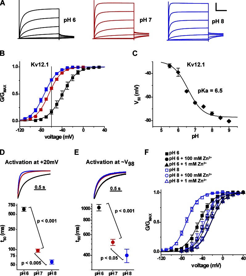 Figure 2. Effect of extracellular pH on voltage activation of Kv12.1. (A) Kv12.1 current traces elicited by 4-s depolarization steps from −100 to 20 mV (in 20-mV increments from a holding potential of −100 mV) are shown for bath solutions of pH 6, 7, and 8. Tail step voltage was −40 mV. Recordings were made from a single Xenopus oocyte using TEVC. Scale bar: 2.5 µA, 1 s. (B) Normalized GV relations for Kv12.1 at pH 6 (black), 7 (red), and 8 (blue). Conductance values were taken from isochronal tail currents recorded at −40 mV after 4-s depolarization steps to the indicated voltages. Error bars show SEM (n = 3–8), and lines show single Boltzmann distribution fits. The gray line at −60 mV indicates the voltage used in Fig. 4 to examine pH-dependent changes in holding current for Kv12.1. (C) Plot of V50 versus pH for Kv12.1. V50 values were determined as in B, and the curve shows a three-parameter dose–response fit yielding a pKa value of 6.5. Error bars show SEM (n = 3–8). (D) Current traces from the 20-mV voltage step in A are normalized and superimposed to highlight changes of activation time course; bath pH is encoded by color as in A. The graph shows the time necessary for Kv12.1 to reach 80% activation (t80) during steps to 20 mV (from a holding potential of −100 mV) at pH 6, 7, and 8. A log10 scale was applied to the t80 axis to better visualize the entire range of values, and statistical significance was judged using a two-tailed nonequal variance Student’s t test. (E) Data are analyzed and presented as in D, but normalized for V50 shift: the voltages selected for each pH were −30 mV for pH 8, −20 mV for pH 7, and 10 mV for pH 6 and corresponded as closely as possible to the same open probability, ∼V98. Data in D and E are mean ± SEM (n = 8). (F) Comparison of Zn2+-dependent shifts in Kv12.1 GV relationships at pH 6 and 8; data (mean ± SEM; n = 3–5) are shown for controls (squares), 100 µM Zn2+, and 1 mM Zn2+, and curves show single Boltzmann distribution fits.