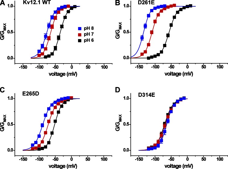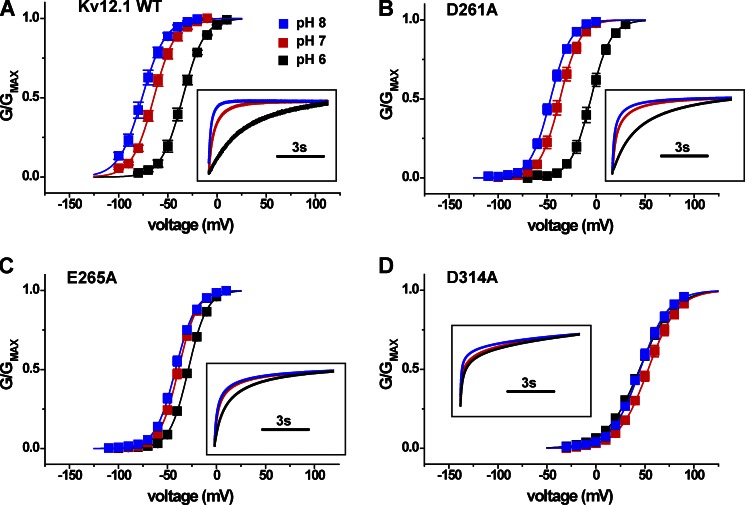 Figure 5. EAG superfamily–specific acidic residues in the voltage sensor are required for modulation of Kv12.1 activation by extracellular pH. (A–D) Normalized GV curves for WT Kv12.1, D261A (D1A), E265A (E5A), and D314A (D6A) are compared at bath pH values of 6, 7, and 8. Conductance was determined from isochronal tail currents recorded at −40 mV after 8-s steps to the indicated voltages; values show mean ± SEM (n = 4–8). Curves show single Boltzmann distribution fits. Fit parameters (V50 and slope factor) are reported in Table 1. Boxed insets show normalized and superimposed current traces for depolarization steps that correspond most closely to V95 asymptotic open probability at pH 7 for each mutant (−30 mV for WT, −10 mV for D261A, −10 mV for E265A, and 90 mV for D314A).