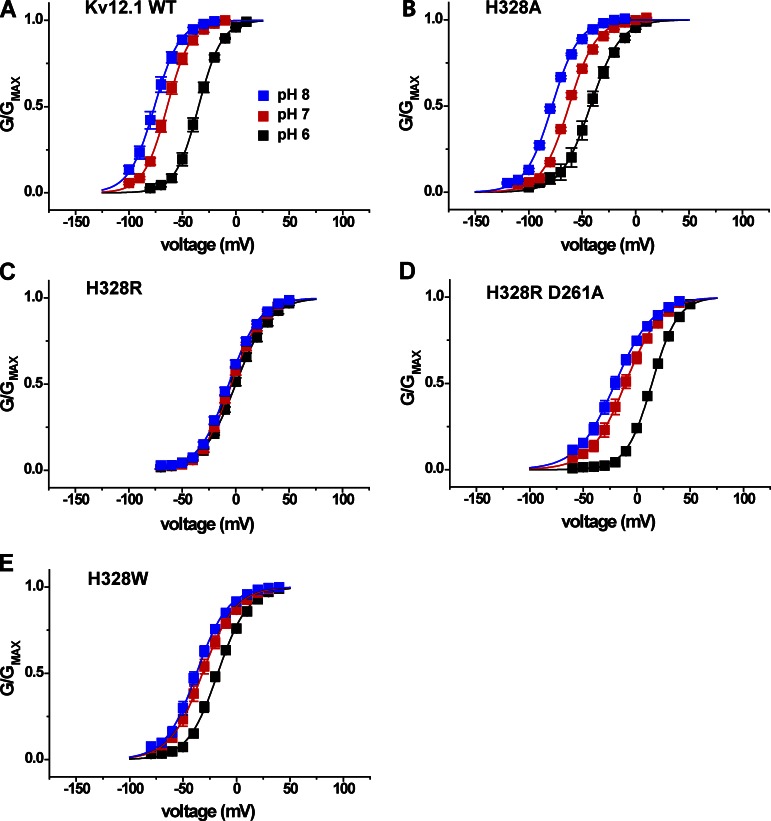 Figure 7. S4 histidine H328 is not required for sensitivity to extracellular pH in Kv12.1. (A–E) Normalized GV relations for Kv12.1 WT and S4 histidine mutants are shown at three bath pH values: pH 6, 7, and 8. Conductance was determined from isochronal tail currents recorded at −40 mV after 8-s steps to the indicated voltages. Data points show mean ± SEM, and curves represent single Boltzmann distribution fits; parameters and n are given in Table 1, and V50 shifts from pH 8 to 6 are reported in Fig. 8.