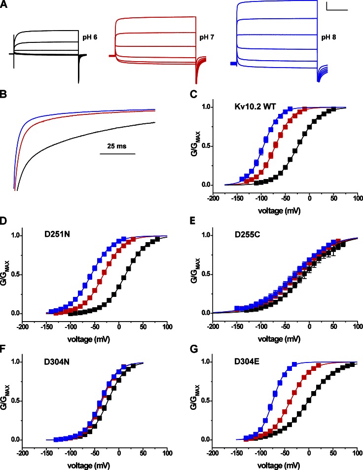 Figure 9. High sensitivity to extracellular pH in Kv10.2 is conferred by EAG-specific acidic residues in the voltage sensor. (A) Kv10.2 current traces elicited by 2-s depolarization steps from −80 to 20 mV in 20-mV increments in bath pH 6, 7, and 8. 50 mM bath K+ was used to accentuate inward tail currents at the −100-mV holding potential. Scale bar: 1 µA, 500 ms. (B) Current traces recorded at 20 mV were normalized and superimposed to illustrate the effect of bath pH on activation time course. pH is encoded by color as in A. (C) Normalized GV relations for Kv10.2 obtained from isochronal tail current measurements at −100 mV in 50 mM K+ after 2-s steps to the indicated voltages in pH 6 (black), 7 (red), and 8 (blue). (D–G) Similar GV curves obtained for Kv10.2 voltage sensor acidic residue mutants D251N (D1N), D255C (D5C) D304N (D6N), and D304E (D6E). Data points in C–G show mean ± SEM (n = 4–10), and curves show single Boltzmann distribution fits; V50, slope factors, and ΔV50 (pH 8 to 6) are reported in Table 1 and Fig. 10.