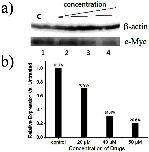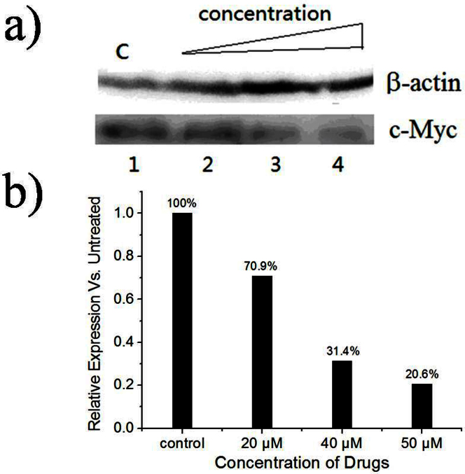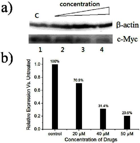 Figure 4. Western Blot was used to determine the expression of c-myc gene in the B16-F1 cells treated with compound 1.The cells were treated with medium (Line 1) and increasing concentrations of compound 1(20, 40 and 50 μM) for 3 days, and the total protein was extracted and subjected to Western Blot for c-Myc, and β-actin (control).