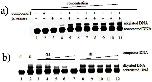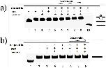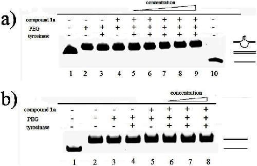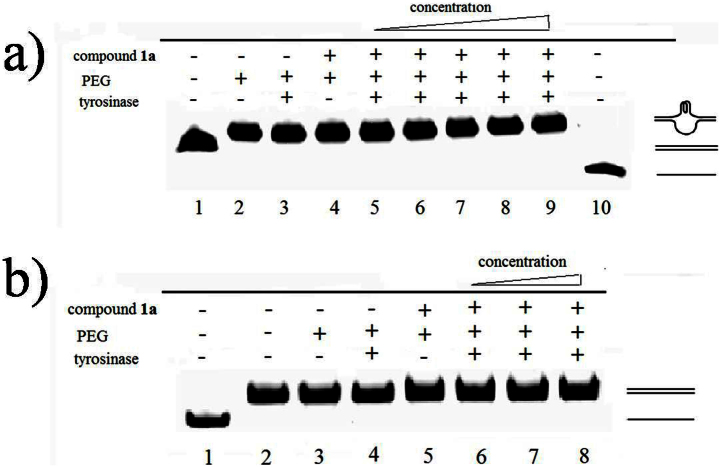 Figure 6. G-quadruplex formation in long dsDNA carrying G-quadruplex-forming sequence from the c-myc gene examined by native gel electrophoresis.a) DNA samples were loaded on 8% polyacrylamide gel containing 150 mM KCl, 40% (w/v) PEG 200 and electrophoresed at in 1× TBE buffer containing 150 mM KCl. Lane 1:c-myc and c-myc-c without PEG; Lane 2: c-myc and c-myc-c with PEG; Lane 3 and 4 are control lanes, c-myc and c-myc-c incubation with compound 1a (2 mM) or tyrosinase (40 Units); lane 5-10 are increasing concentrations of compound 1a (100 μM, 200 μM, 500 μM, 1 mM, 2 mM) incubation with c-myc and c-myc-c in the presence of tyrosinase (40 Units); Lane 10: c-myc-c only. All samples contain 150 mM KCl. b) DNA samples were loaded on 8% polyacrylamide gel containing 40% (w/v) PEG 200 and electrophoresed at in 1× TBE buffer. Lane 1: c-myc-c only; Lane 2: c-myc and c-myc-c without PEG; Lane 3: c-myc and c-myc-c with PEG; Lane 4 and 5 are control lanes, c-myc and c-myc-c incubation with compound 1a (2 mM) or tyrosinase (40 Units); lane 6-8 are increasing concentrations of compound 1a (500 μM, 1 mM, 2 mM) incubation with c-myc and c-myc-c in the presence of tyrosinase (40 Units), All samples were free off KCl.