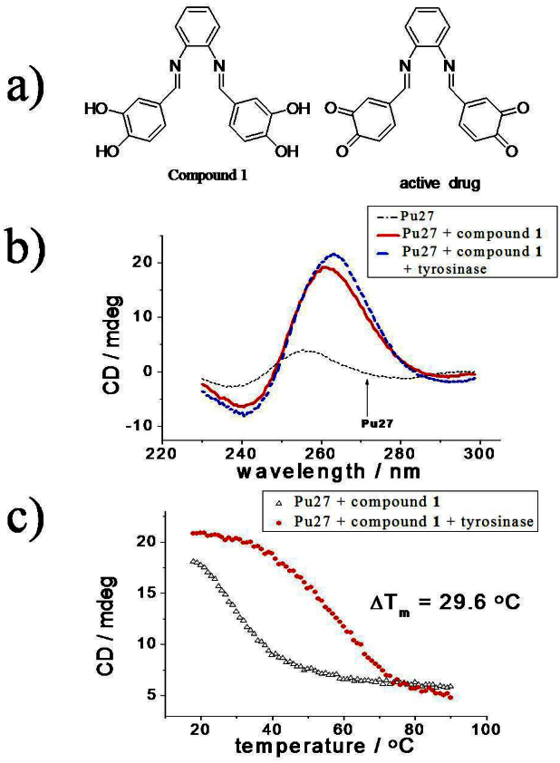 Figure 1. a) Structures of compound 1 and o-quinone intermediate induced by tyrosinase. b) CD spectra of Pu27 DNA (20 μM) in 10 mM Tris/HCl buffer at pH 7.0 in the absence or presence of compound 1 ([compound 1]/[DNA strand] = 5) without or with incubation with tyrosinase (400 Units) at 37°C for 1 h. c) CD melting of Pu27 DNA curves in the presence of compound 1 ([compound 1]/[DNA strand] = 5) without or with incubation with tyrosinase (400 Units) at 37°C for 1 h, as monitored by the CD intensity at 265 nm. Tm values of the two G-quadruplexes are 30.3°C and 59.9°C, respectively.