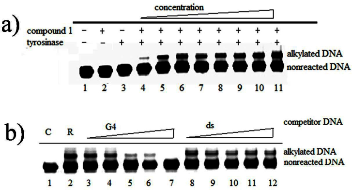 Figure 2. a) Concentration dependence of compound 1 for tyrosinase oxidation DNA alkylating were incubated with 5′-end TAMRA labeled Pu27 DNA in 10 mM Tris/HCl buffer at pH 7.0 for 1 h at 37°C. The amounts of labeled DNA and tyrosinase were fixed as 10 pmol and 40 Units, respectively. Lane 1–3 are control lanes, lane 4–11 are increasing concentrations of compound 1 (10 μM, 20 μM, 50 μM, 0.1 mM, 0.2 mM, 0.5 mM, 1 mM, 2 mM) incubation with labeled Pu27 DNA and tyrosinase (40 Units). The alkylated oligo was separated from the nonreacted DNA by 20% denaturing polyacrylamide gel. b) Compound 1 (1 mM) was incubated with labeled Pu27 DNA (10 pmol) and tyrosinase (40 Units) in the presence of increasing molar ratios (0.5, 1, 2, 5, 10) of unlabeled Pu27 DNA(G4) or unlabeled ds-Pu27 DNA(double-stranded, ds) for 1 h at 37°C. The alkylated oligo was separated from the nonreacted DNA by 20% denaturing polyacrylamide gel. “C” refers to labeled Pu27 DNA (10 pmol) treated at 37°C for 1 h, and “R” refers to the Pu27-compound 1 reaction product in the absence of any competitor DNA.