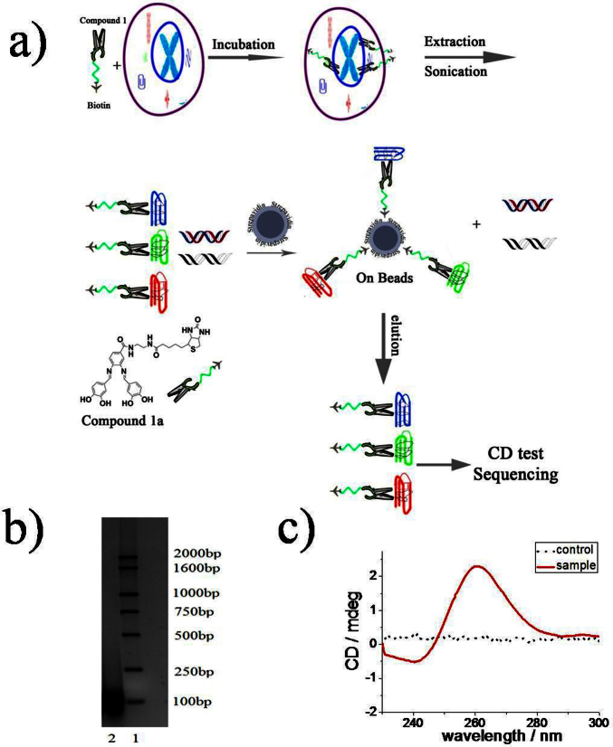Figure 5. a) Experimental design for detecting formation of G-quadruplexes and sequencing in oncogene promoters in B16-F1 cells. b)1.5% agarose gel. Lane 1: DNA ladder and lane 2: approximately 100 bp sonicated in genomic DNA. c) CD spectrum of genomic DNA short fragments which was extracted from B16-F1 cells in the absence or presence of compound 1a (40 μM) for 3d.