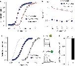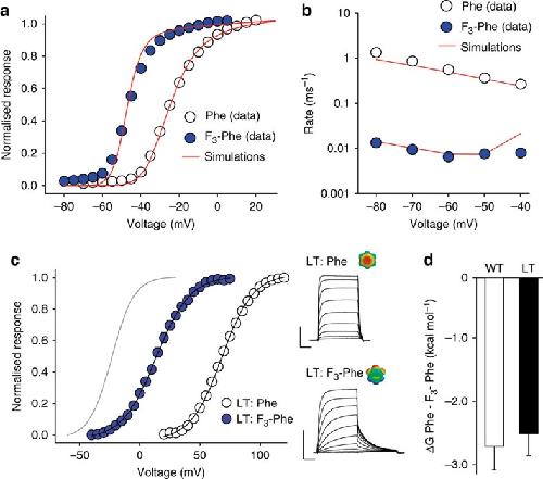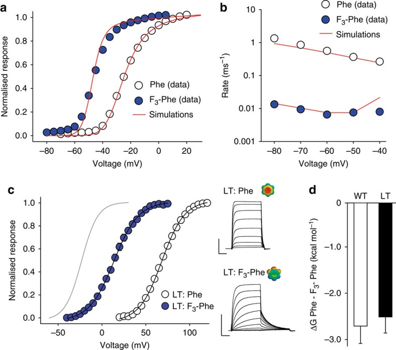 Figure 3. Kinetic modeling and mutational studies confirm open-state stabilization through fluorination.(a) Experimentally observed GV data points for Phe and F3-Phe (open and blue circles, respectively; reproduced from Fig. 1f) overlaid by the simulated data based on kinetic modelling using the ZHA model (red lines); (b) Experimentally observed deactivation rates for Phe and F3-Phe (open and blue circles, respectively; reproduced from Fig. 2f) compared with the simulated deactivation rates for Phe and F3-Phe based on kinetic modelling using the ZHA model (red lines); (c) GVs for Phe and F3-Phe introduced on the Ile372Leu, Ser376Thr (LT) double-mutant background (open and blue circles, respectively). The fit for the WT GV is shown in grey, insets show representative currents. Scale bar (horizontal), 20 ms; Scale bar (vertical), 4 μA. (d) Bar diagram comparing the free energy difference between Phe and F3-Phe incorporated at position 481 on the WT (empty bar) or LT double-mutant background (black bar). All experimental data=mean±s.e.m.