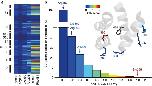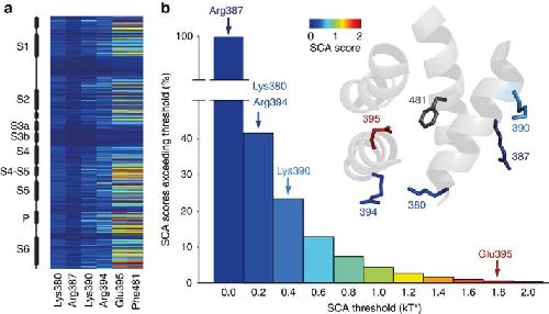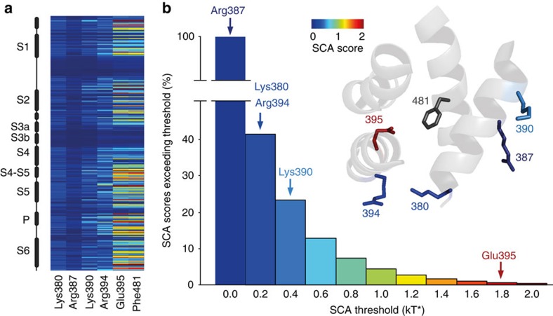 Figure 4. SCA analysis highlights the varying levels of co-evolution between Phe481 and nearby charged side chains.(a) SCA scores of Phe481 and all five charged side chains that are within 12 Å of Phe481 with the vertical axis representing all side chains considered for the SCA analysis (corresponding to positions 208 to 487 in Shaker, with black boxes representing α-helical regions in the channel). Scale bar as in (b). (b) Bar diagram indicating the percentage of SCA scores exceeding the binned threshold indicated on the x axis for all pairings in the SCA analysis. The SCA scores of all five charged side chains with respect to Phe481 are highlighted with arrows (Arg387=0.13 kT*, Lys380=0.20 kT*, Arg394=0.21 kT*, Lys390=0.47 kT* and Glu395=1.93 kT*); Note the high co-evolution score for the Glu395-Phe481 coupling. Inset shows the scale of the heat map used in (a,b) and a model displaying all five charged side chains that are within 13 Å of Phe481. Note that the charged side chains are coloured by their SCA score values (Phe481 is shown in dark grey as all SCA scores are relative to Phe481 in this analysis).