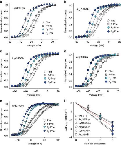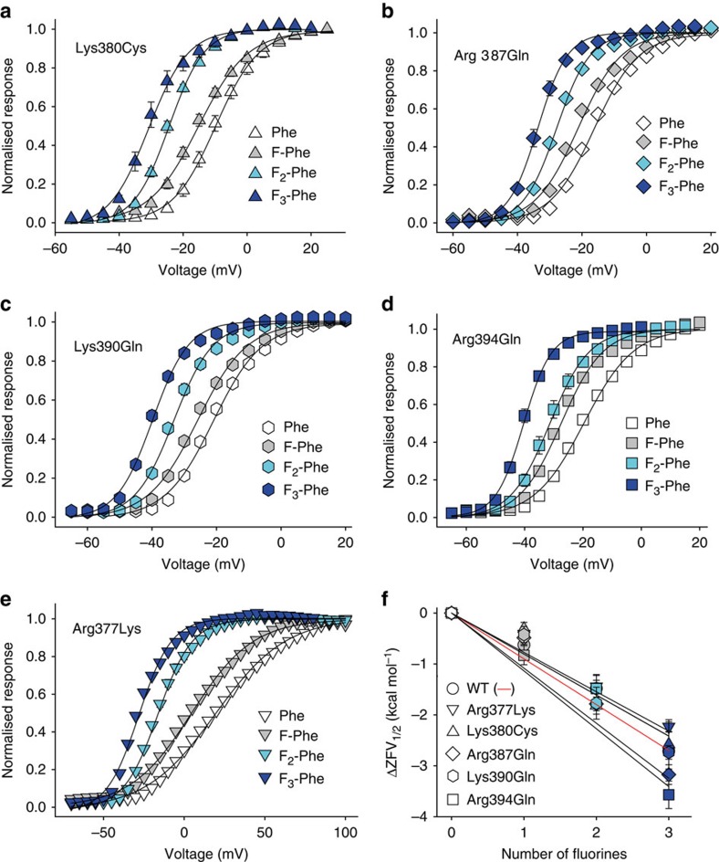 Figure 5. Nearby positive charges are unlikely to interact with the electrostatic surface potential of Phe481.(a–e) GVs of Phe and fluorinated Phe derivatives incorporated at position 481 on the background of Lys380Cys (a), Arg387Gln (b), Lys390Gln (c), Arg394Gln (d) and Arg377Lys (e) (n=3–11 each, see also Supplementary Table S1); (f) ΔZFV1/2 values plotted against the number of fluorines for Phe and fluorinated Phe derivatives incorporated at position 481 on the background of Lys380Cys, Arg387Gln, Lys390Gln, Arg394Gln and Arg377Lys. Lines indicate linear fits obtained with f=y0+a*x, with y0=0 (mutants in black, WT in red). All data=mean±s.e.m.