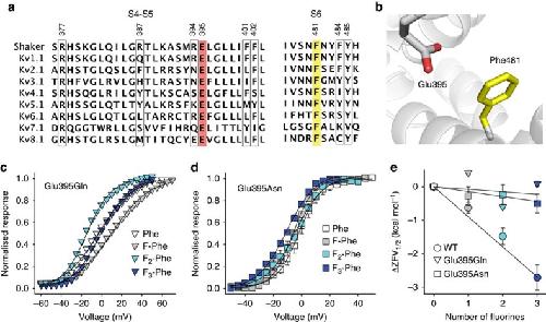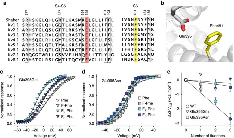 Figure 6. Glu395 is likely to inherently destabilize the open state via electrostatic repulsion with Phe481.(a) Sequence alignment of the S4–S5 linker and the distal part of S6 in various Kv channels (see Fig. 1 for details). The conserved Glu and Phe side chains are highlighted in red and yellow, respectively; other residues tested in this study are highlighted by black boxes (Shaker numbering); (b) Model highlighting the proximity of Glu395 to Phe481 (based on a refined model of the Kv1.2 open channel crystal structure42); (c,d) GVs of Phe and fluorinated Phe derivatives incorporated at position 481 on the background of Glu395Gln (c) and Glu395Asn (d) (n=3–6 each; see also Supplementary Table S1); (e) ΔZFV1/2 values plotted against the number of fluorines for Phe and fluorinated Phe derivatives incorporated at position 481 on the background of Glu395Gln and Glu395Asn (compared with WT). Lines indicate linear fits obtained with f=y0+a*x, with y0=0. All data=mean±s.e.m.