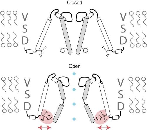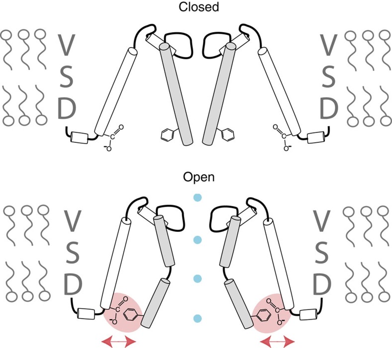 Figure 7. Cartoon of a putative repulsive electrostatic interaction between Phe481 and Glu395 in the channel open state.Cartoon of the pore forming helices of two opposing potassium channel subunits in the closed (upper panel) and open (lower panel) conformation, respectively. VSD stands for voltage-sensor domain. The close proximity of the Glu395 carboxyl and the Phe481 aromatic moiety in the open state are highlighted by the red oval; the electrostatic repulsion between the two is symbolized by the red arrows. The blue dots represent potassium ions along the permeation pathway. Note that for reasons of simplicity the model depicts an intrasubunit interaction between Glu395 and Phe481, while in the full-length channel the shortest distance between Glu395 and Phe481 is between adjacent subunits, thus indicating an intersubunit interaction.