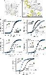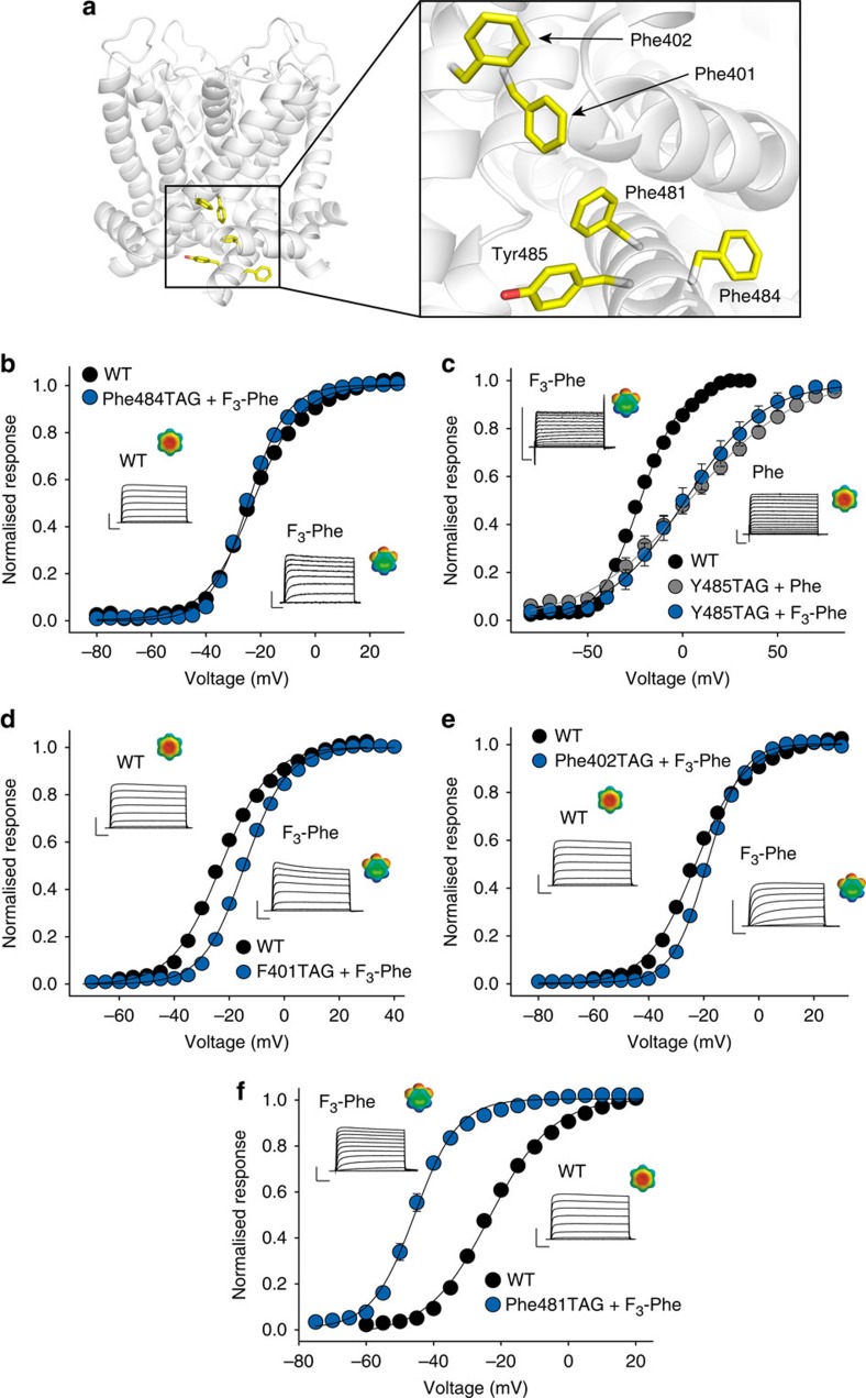 Figure 1. The effect of fluorination is specific to position 481.(a) Model of the pore domain of the tetrameric Kv1.2/2.1 chimera (the voltage-sensing domains are omitted for clarity), with the positions of Phe401, Phe402, Phe481, Phe484 and Tyr485 highlighted in yellow. The inset shows a close-up view of the five aromatic side chains; (b–f) GVs for WT and F3-Phe incorporated at positions 484 (b), 485 (c), 401 (d), 402 (e) and 481 (f); note that at position 485 the native Tyr was also replaced by Phe; insets show currents (−60 to +30 mV in (a,c–f); −60 to +90 mV in (b); all in 10 mV increments) and electrostatic surface potential maps for Phe and F3-Phe (ESP, red=−15 kcal mol−1, green=0 kcal mol−1, blue=+15 kcal mol−1). Scale bar (horizontal), 20 ms; Scale bar (vertical), 5 μA in (c,d–f), 2 μA in (c). WT, V1/2=−23.0±0.5 mV; Phe401TAG+F3-Phe, V1/2=−14.4±0.7; Phe402TAG+F3-Phe, V1/2=−19.0±0.6 mV, Phe484TAG+F3-Phe, V1/2=−24.6±0.6 mV; Tyr485TAG+Phe, V1/2=1.9±5.1 mV, Tyr485TAG+F3-Phe, V1/2=4.6±3.9 mV; Phe481TAG+F3-Phe, V1/2=−45.7±0.8 mV (n=4–10 each). All data=mean±s.e.m.