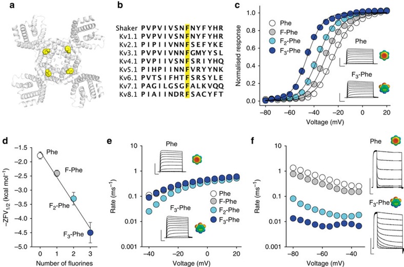 Figure 2. Reducing the negative electrostatic surface potential on Phe481 stabilizes the channel open state.(a) Model showing the tetrameric Kv1.2/2.1 chimera from the intracellular side. The distal part of S6 has been removed for better visibility of Phe481 (Shaker numbering), which is highlighted in yellow. (b) Sequence alignment of the distal end of S6 of various Kv channels: Shaker (GI:288442), Kv1.1 (GI:119395748), Kv2.1 (GI:84570020), Kv3.1 (GI:298603), Kv4.1 (GI:8272404), Kv5.1 (GI:24418476), Kv6.1 (GI:24418479), Kv7.1 (GI:6166005) and Kv8.1 (GI:7657289). The conserved Phe (Phe481 in Shaker) is highlighted in yellow. (c) GVs of Phe and fluorinated Phe derivatives incorporated at position 481 (n=8–10 each; see also Supplementary Table S1); insets show representative currents (−70 to +40 mV in 10 mV increments, F3-Phe reproduced from Fig. 1f) and electrostatic surface potential maps for Phe and F3-Phe (scale as in Fig. 1). (d) ZFV1/2 values plotted against the number of fluorines for Phe and fluorinated Phe derivatives incorporated at position 481. (e) Activation rates plotted against voltage for Phe and fluorinated Phe derivatives incorporated at position 481; insets show sample traces for Phe and F3-Phe (depolarizations in 10 mV increments from a holding potential of -80 mV, traces shown from −70 mV to 40 mV). (f) Deactivation rates plotted against voltage for Phe and fluorinated Phe derivatives incorporated at position 481; insets show sample traces for Phe and F3-Phe (after a depolarizing step to 0 mV different test potentials were applied in 10 mV increments, traces shown from 0 to −100 mV). Scale bar (horizontal), 20 ms in (c,e), Scale bar, 50 ms in (f); Scale bar (vertical), 10 μA in (c,e), Scale bar, 5 μA in (f). All data=mean±s.e.m.