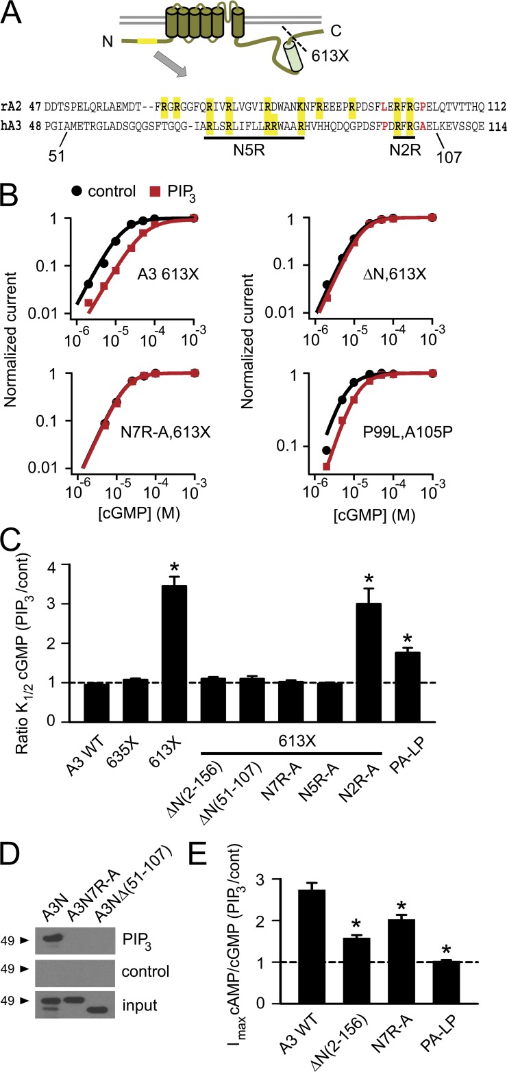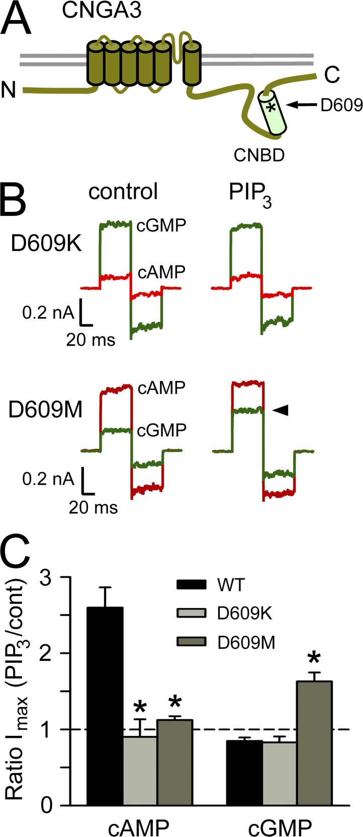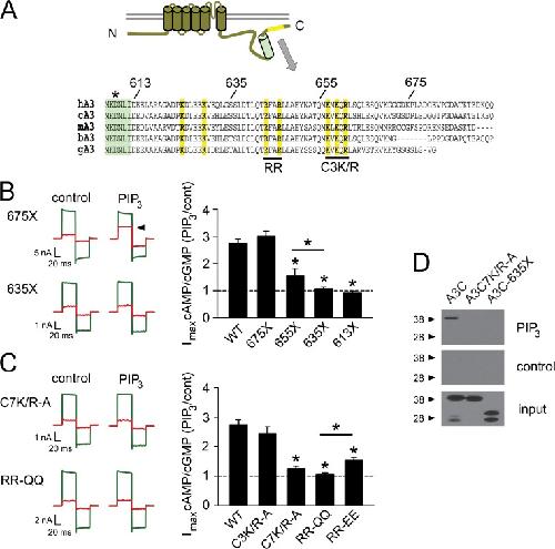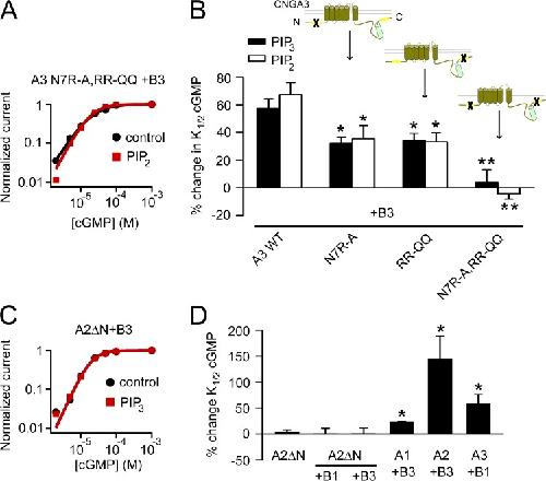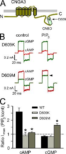 Two structural components in CNGA3 support regulation of cone CNG channels by phosphoinositides.