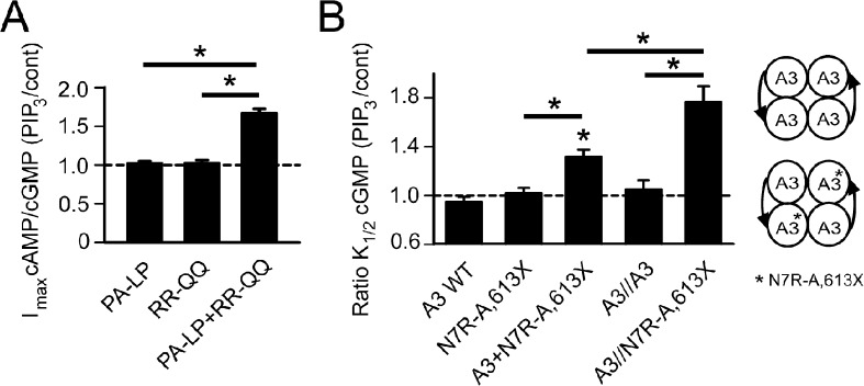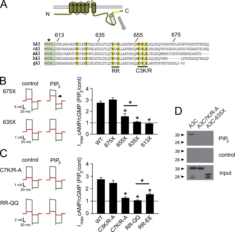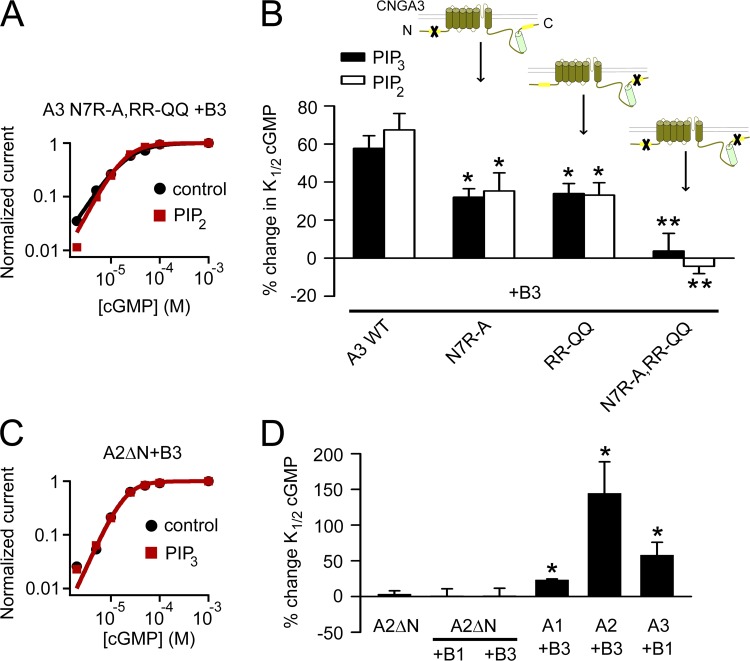 Cyclic nucleotide-gated (CNG) channels in retinal photoreceptors play a crucial role in vertebrate phototransduction. The ligand sensitivity of photoreceptor CNG channels is adjusted during adaptation and in response to paracrine signals, but the mechanisms involved in channel regulation are only partly understood. Heteromeric cone CNGA3 (A3) + CNGB3 (B3) channels are inhibited by membrane phosphoinositides (PIP(n)), including phosphatidylinositol 3,4,5-triphosphate (PIP(3)) and phosphatidylinositol 4,5-bisphosphate (PIP(2)), demonstrating a decrease in apparent affinity for cyclic guanosine monophosphate (cGMP). Unlike homomeric A1 or A2 channels, A3-only channels paradoxically did not show a decrease in apparent affinity for cGMP after PIP(n) application. However, PIP(n) induced an ∼2.5-fold increase in cAMP efficacy for A3 channels. The PIP(n)-dependent change in cAMP efficacy was abolished by mutations in the C-terminal region (R643Q/R646Q) or by truncation distal to the cyclic nucleotide-binding domain (613X). In addition, A3-613X unmasked a threefold decrease in apparent cGMP affinity with PIP(n) application to homomeric channels, and this effect was dependent on conserved arginines within the N-terminal region of A3. Together, these results indicate that regulation of A3 subunits by phosphoinositides exhibits two separable components, which depend on structural elements within the N- and C-terminal regions, respectively. Furthermore, both N and C regulatory modules in A3 supported PIP(n) regulation of heteromeric A3+B3 channels. B3 subunits were not sufficient to confer PIP(n) sensitivity to heteromeric channels formed with PIP(n)-insensitive A subunits. Finally, channels formed by mixtures of PIP(n)-insensitive A3 subunits, having complementary mutations in N- and/or C-terminal regions, restored PIP(n) regulation, implying that intersubunit N-C interactions help control the phosphoinositide sensitivity of cone CNG channels.