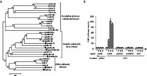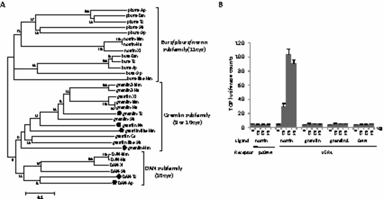 Norrin is a ligand for LGR4. (A) Phylogenetic relationship of norrin, burs, pburs, gremlin, and DAN. Genes with cystine-knot structures homologous to burs and pburs were categorized into three subfamilies by the ClustalW program (Thompson et al., 1994). The phylogenetic tree was built with Mega 4 (Tamura et al., 2007) using the Neighbor-Joining method and 1000 bootstrap replications. The numbers at interior branches refer to the bootstrap values (in percentages). Sk, Saccoglossus kowalevskii; Ce, Caenorhabditis elegans; Hm, Hydra magnipapillata; Dm, Drosophila melanogaster; Nv, Nematostella vectensis; Xt, Xenopus tropicalis (Silurana); Mm, Mus musculus; Hs, Homo sapiens; Ap, Acyrthosiphon pisum; Tc, Tribolium castaneum. (B) Norrin, but not gremlin or DAN, stimulated Wnt signaling in HEK293T cells expressing LGR4. HEK293T cells were transfected with TOPFLASH, LGR4, together with increasing amounts of plasmids encoding norrin, gremlin, gremlin2 or DAN before luciferase assays.
