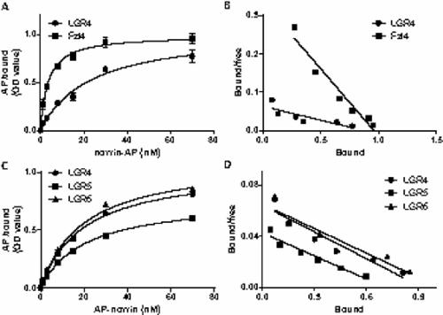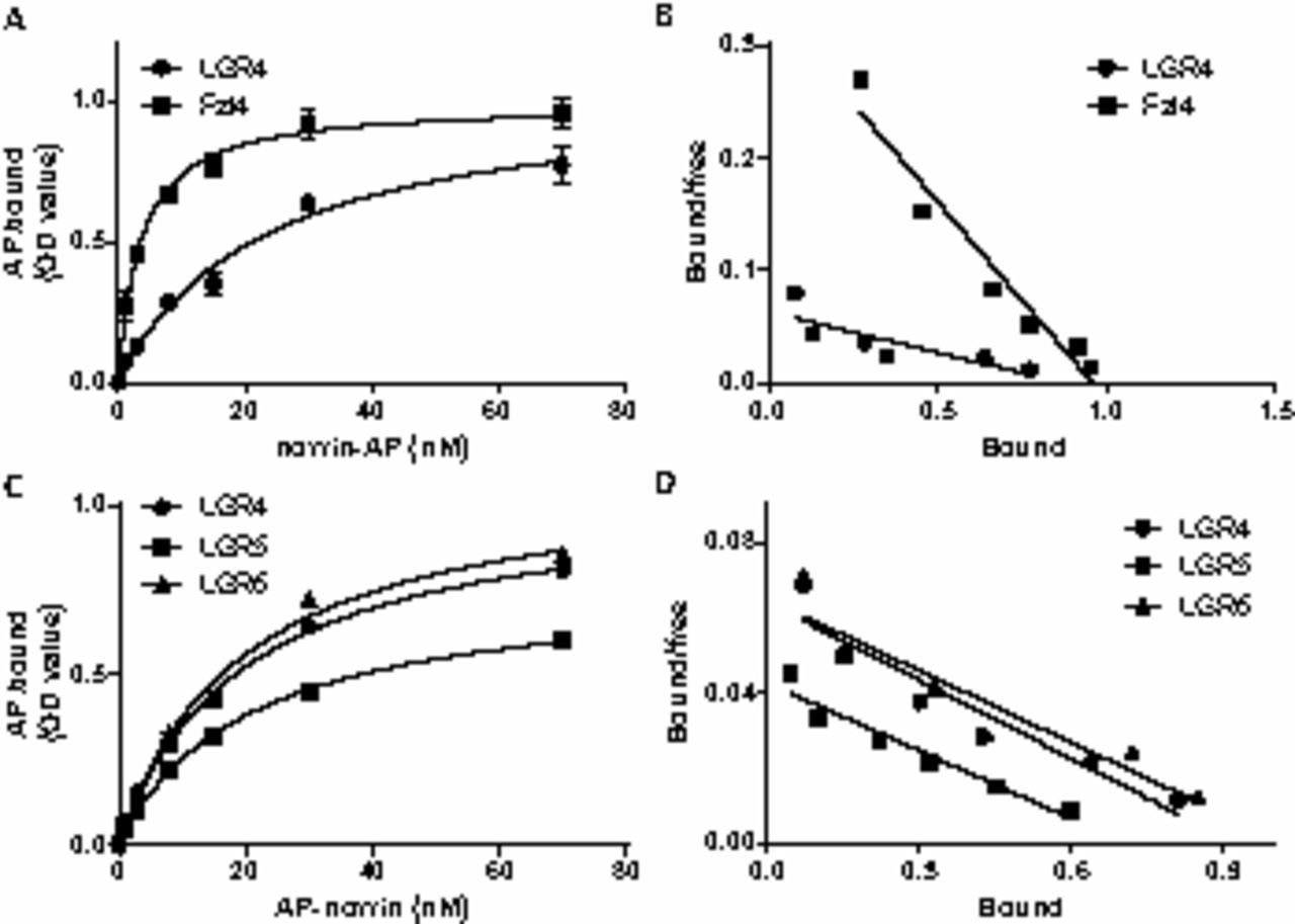 Direct binding of norrin to LGR4, 5 and 6. (A) Saturation curves for AP–norrin binding to LGR4 and Fzl4. After knocking down endogenous LGR4, HEK293T cells were transfected with empty vector or plasmids encoding human LGR4 or Fzl4 for 6 hours. After culturing for 2 days, cells were incubated with AP–norrin for 90 minutes at 23°C before determination of alkaline phosphatase activities. Specific binding was calculated by subtracting the values from cells transfected with the empty plasmids. (B) Scatchard analysis of AP–norrin binding to HEK293T cells expressing LGR4 or Fzl4. (C) Binding of AP–norrin to LGR4, 5 and 6 after knocking down endogenous LGR4. (D) Scatchard analysis of AP–norrin binding to HEK293T cells expressing LGR4, 5 or 6.
