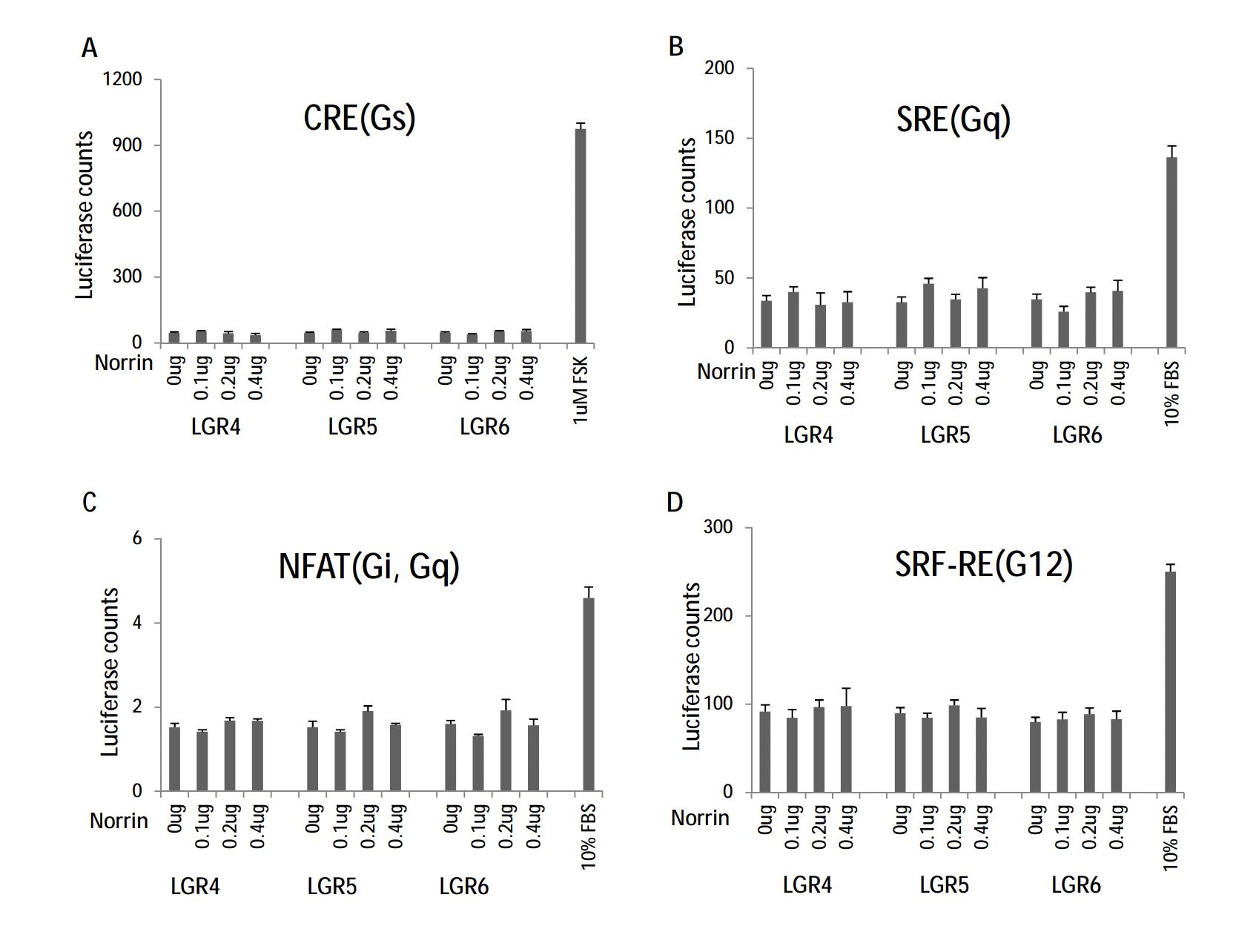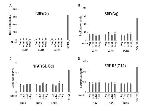Fig. S2. Norrin does not stimulate G protein signaling in LGR4/5/6-expressing HEK293 cells. (A) CRE-luciferase reporter for Gs