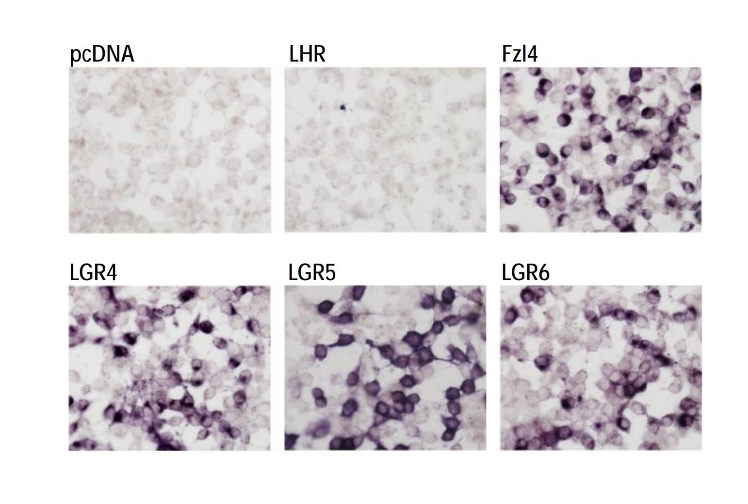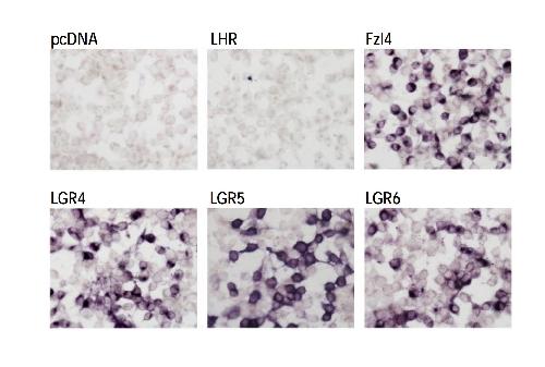 AP-norrin showed positive signals in cells expressing Fzl4, LGR4, LGR5 and LGR6, but not LHR (Luteinizing Hormone Receptor).