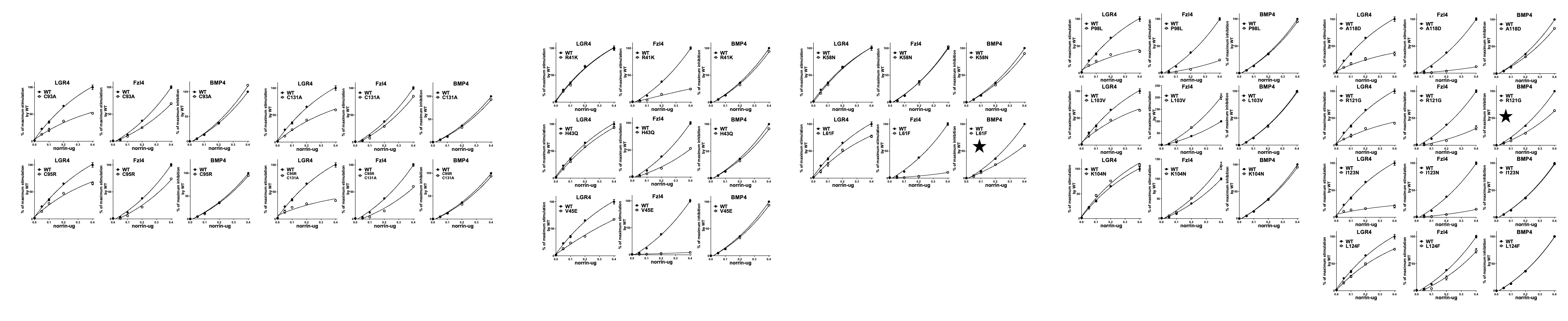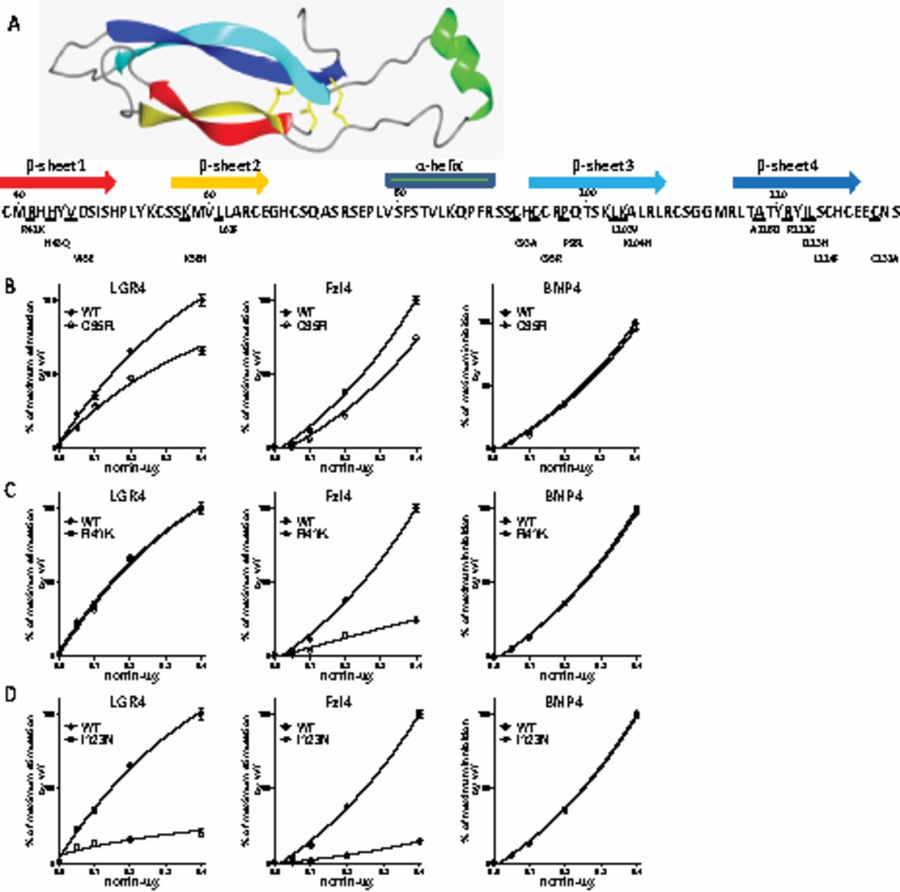 (A) Four cysteine mutants of norrin (93A, C95R, C131A, C95R+C131A), (B) five mutants of norrin (R41K, H43Q, V45E, K58N,