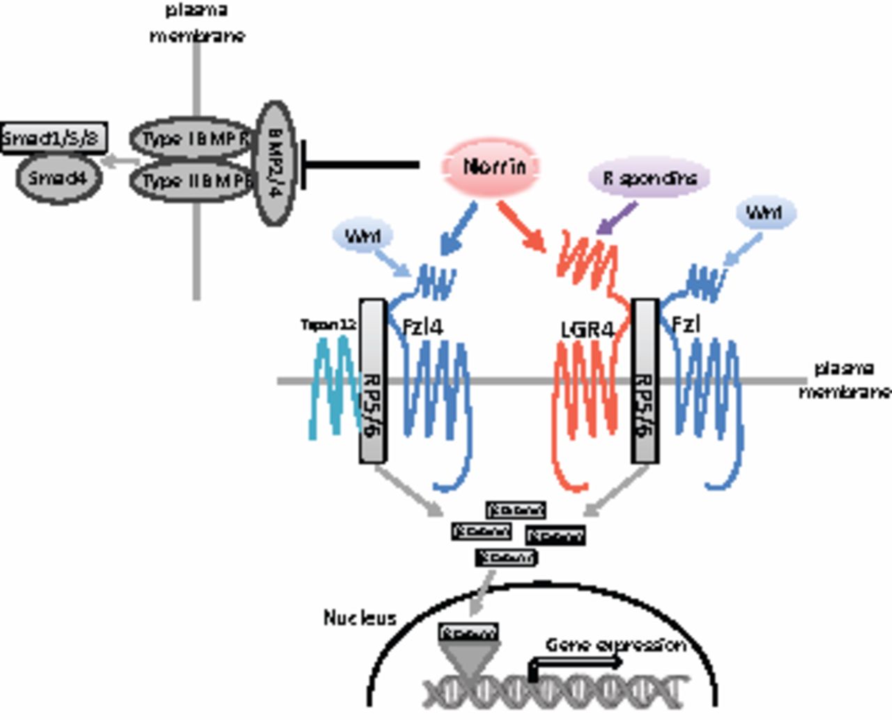 Diagram of norrin as a multifunctional ligand for three receptors/binding proteins. Norrin binds to LGR4, which is also the receptor for R-spondin proteins. LGR4 presumably cooperates with Frizzled (Fzl) receptors activated by Wnt ligands to promote the internalization of LRP5/6, leading to increases in β-catenin levels and the expression of downstream Wnt pathway genes. Norrin also interacts directly with Fzl4 and an auxiliary membrane protein Tspan12 to promote LRP5/6 internalization and to increase β-catenin levels. In addition, norrin binds to BMP2/4 to block the activation of type I and II BMP receptors, leading to decreases in downstream Smad activities. Mutations in humans associated with Norrie disease result in diverse phenotypes probably because of differential activation of Wnt signaling mediated by LGR4 or Fzl4 as well as differential BMP antagonistic activities.