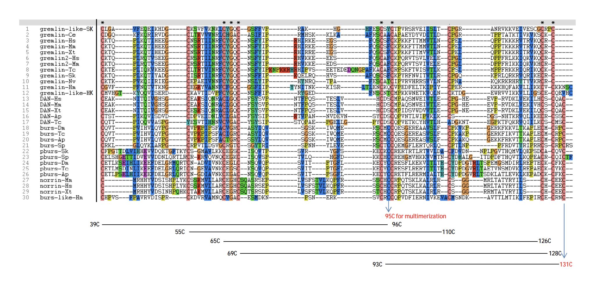 subfamilies using the ClustalW program (Thompson et al., 1994). Residues C95 and C131, missing in the gremlin or DAN subfamily