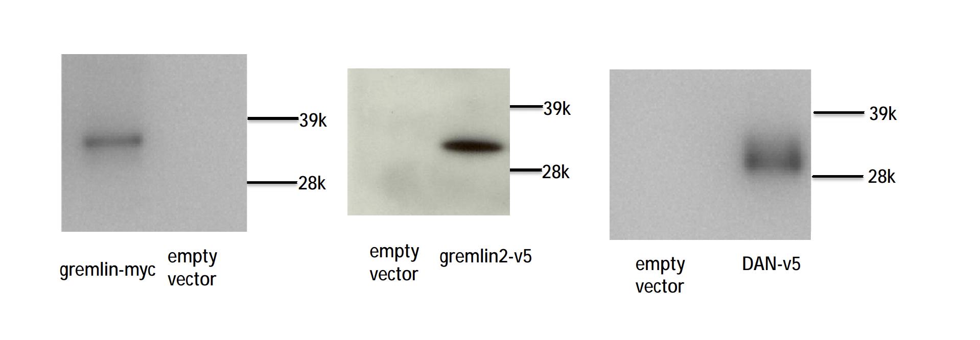levels for gremlin, gremlin2, and DAN proteins were determined using immunoblotting of conditioned media as described in the