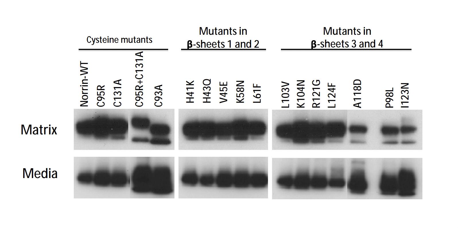 transfected with plasmids encoding norrin and its mutants before immunoblotting analyses of secreted and matrix-bound proteins.
