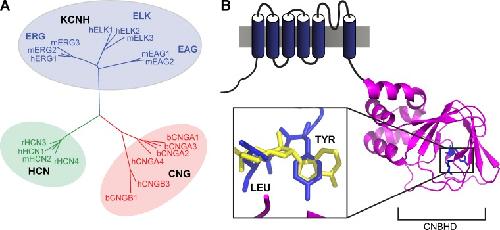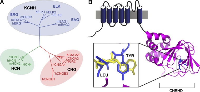 Figure 1. Dendrogram and basic architecture of channels of the cyclic nucleotide–regulated superfamily. (A) Phylogenetic tree depicting the evolutionary relationships of the KCNH, CNG, and HCN ion channel families, computed with Cobalt (Papadopoulos and Agarwala, 2007) and displayed with Dendroscope (Huson et al., 2007). (B) Schematic of the architecture of a single mEAG1 subunit, with the structure of the CNBHD shown in magenta (Marques-Carvalho et al., 2012) and the tyrosine and leucine of the intrinsic ligand shown in blue. Inset includes a close-up view of the tyrosine and leucine of the intrinsic ligand superimposed with cAMP (yellow) from the HCN2 structure (Zagotta et al., 2003). Superposition of the mEAG1 and mHCN2 structures was done through residues in the β roll.