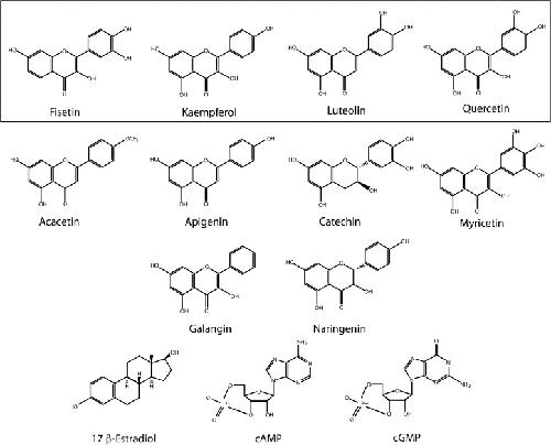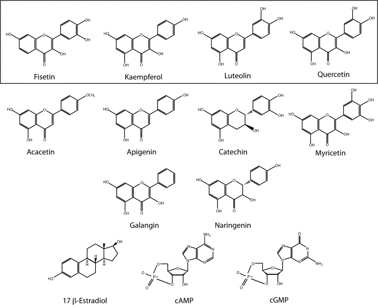 Figure 2. Chemical structures of screened flavonoids and structurally related compounds. The following flavonoids were included in this screen: fisetin (2-(3,4-dihydroxyphenyl)-3,7-dihydroxychromen-4-one), kaempferol (3,5,7-trihydroxy-2-(4-hydroxyphenyl)-4H-chromen-4-one), luteolin (2-(3,4-dihydroxyphenyl)- 5,7-dihydroxy-4-chromenone), quercetin (2-(3,4-dihydroxyphenyl)-3,5,7-trihydroxy-4H-chromen-4-one), acacetin (5,7-dihydroxy-2-(4-methoxyphenyl)chromen-4-one), apigenin (5,7-dihydroxy-2-(4-hydroxyphenyl)-4H-1-benzopyran-4-one), catechin ((2R,3S)-2-(3,4-dihydroxyphenyl)-3,4-dihydro-2H-chromene-3,5,7-triol), myricetin (3,5,7-trihydroxy-2-(3,4,5-trihydroxyphenyl)-4-chromenone), galangin (3,5,7-trihydroxy-2-phenylchromen-4-one), and narnigenin (5,7-dihydroxy-2-(4-hydroxyphenyl)chroman-4-one). The steroid hormone 17-β-estradiol ((17β)-estra-1,3,5(10)-triene-3,17-diol) and the cyclic nucleotides cAMP (3′5′-cyclic adenosine monophosphate) and cGMP (3′5′-cyclic guanosine monophosphate) were also included in this screen. Box highlights the compounds that potentiated mEAG1 currents.