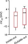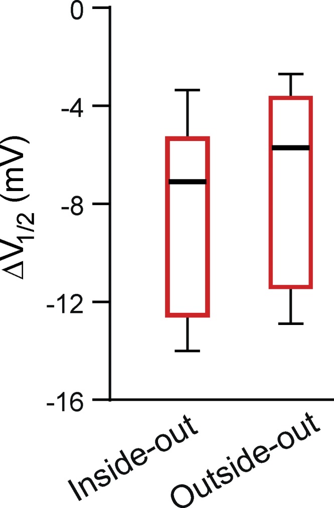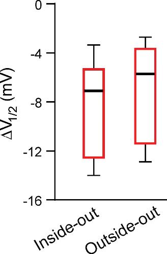 Figure 4. Fisetin potentiated mEAG1 currents recorded in both inside-out and outside-out patches. Box plots depicting the distributions of the shifts of the V1/2 of the conductance–voltage relationships in the presence of 10 µM fisetin applied to mEAG1 channels and recorded in the inside-out or outside-out configuration of the patch-clamp technique (n = 4–7).
