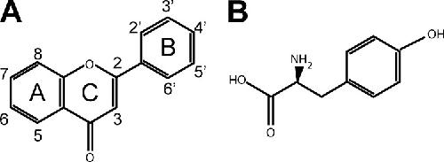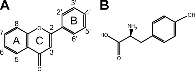 Figure 9. Flavone and tyrosine structures. (A) Chemical structure of the flavone subclass of flavonoids and (B) structure of the amino acid tyrosine.