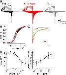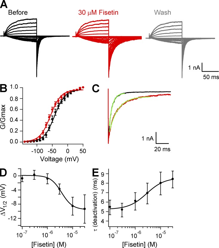 Figure 3. Fisetin modulated mEAG1 currents. (A) Representative current traces of mEAG1 channels recoded in the inside-out patch configuration in the absence (black), presence (red), and after washout (gray) of 30 µM fisetin. (B) The averaged conductance–voltage relationship of mEAG1 channels with 0 (black) or 30 µM fisetin (red) fit with a Boltzmann function (n = 6). (C) The tail current recorded at −120 mV after a voltage step to 50 mV in the absence (black) and presence (red) of 30 µM fisetin. Fits of these tail currents with single exponentials reported the time constant of deactivation: 5.3 ms before and 13.9 ms with 30 µM fisetin. (D) Plot of the ΔV1/2 versus free fisetin concentration fit with a Hill equation (n = 5). The half-maximal concentration of fisetin was 3.5 ± 0.4 µM. (E) Plot of the time constant of mEAG1 deactivation versus free fisetin concentration, fit with a Hill equation (n = 5). The half-maximal concentration of fisetin was 6.6 ± 3.7 µM.